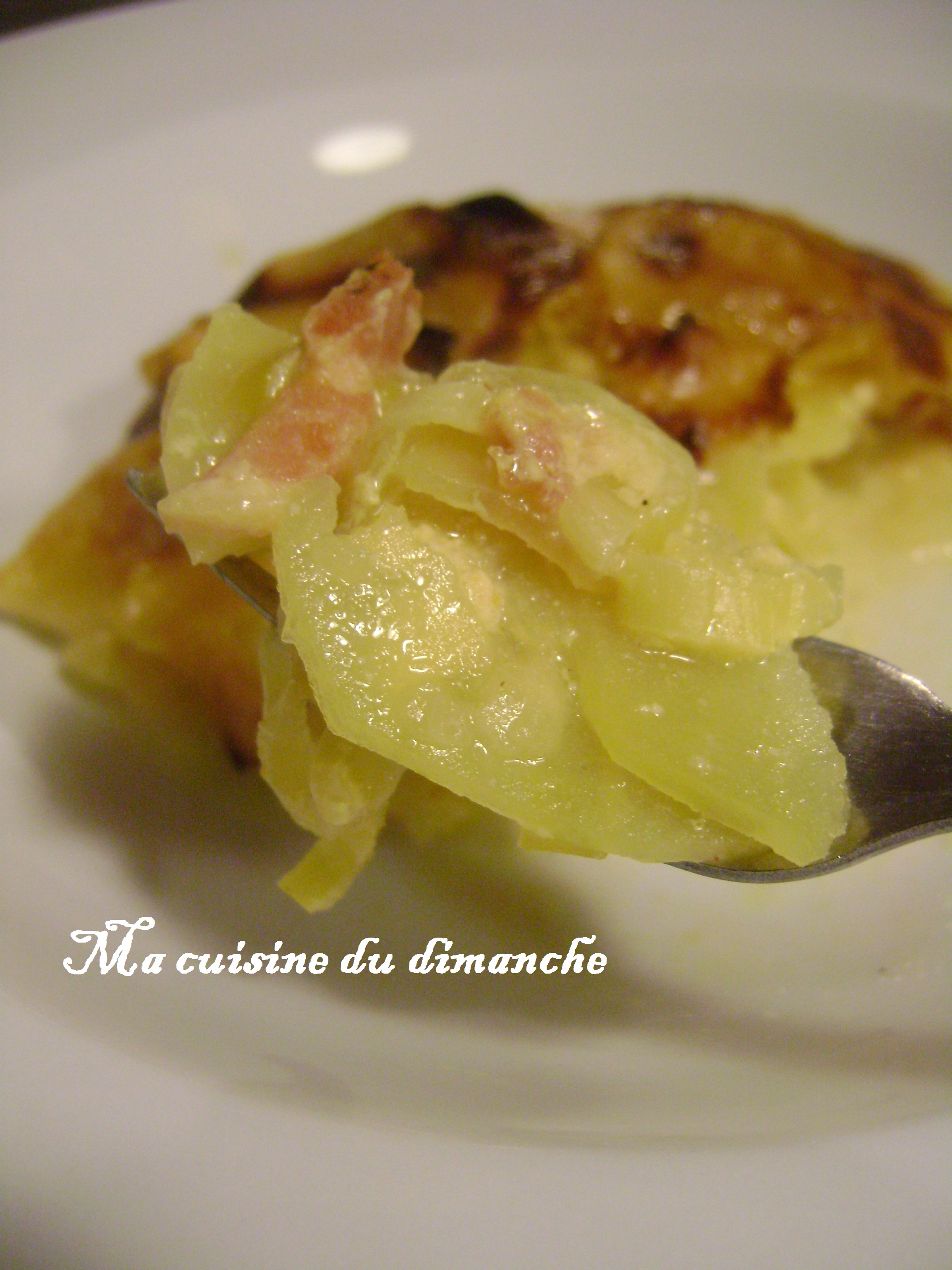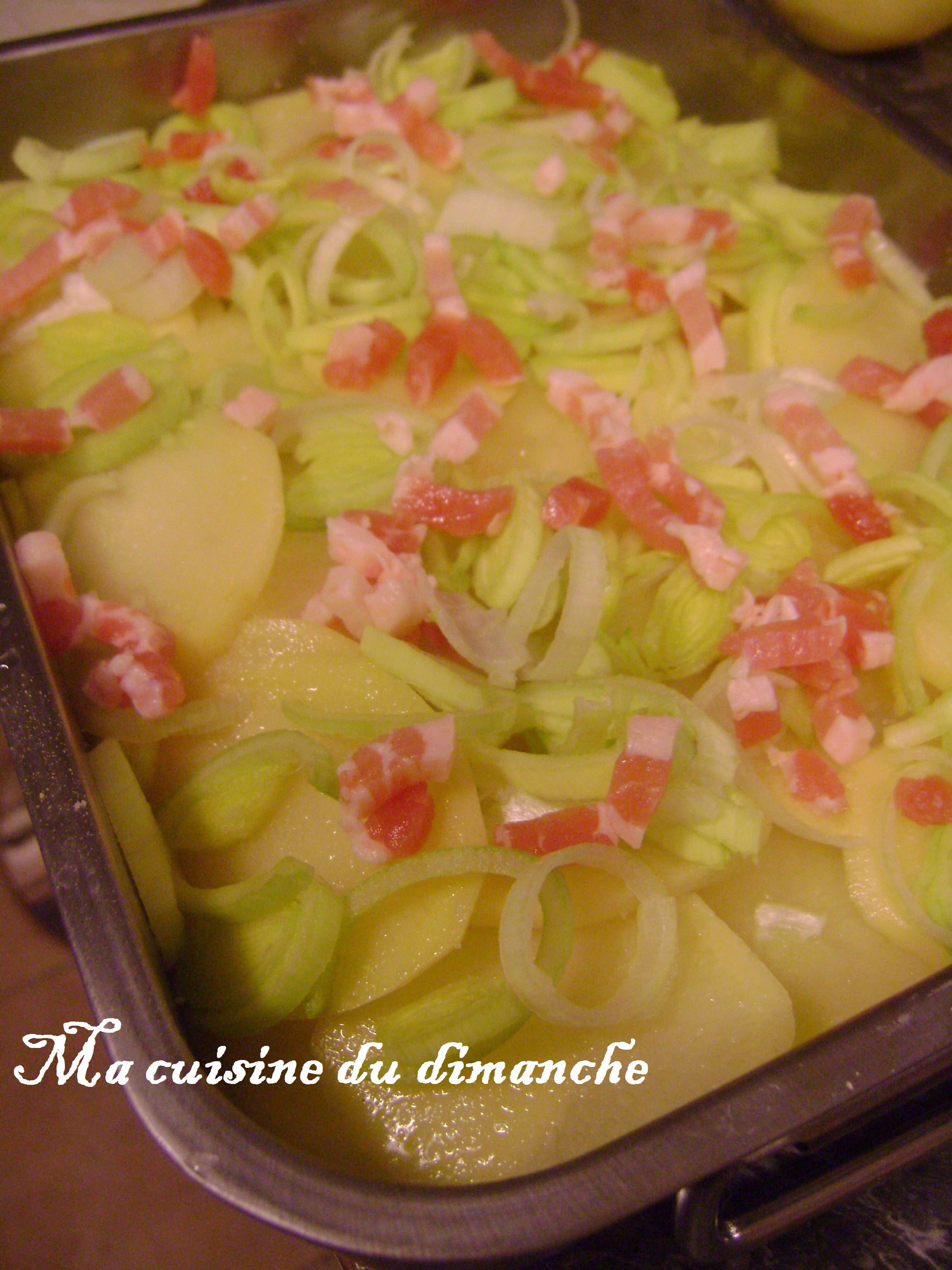 - Rajouter par dessus une couche de poireaux et de lardons et monter les couches ainsi de suite (pomme de terre, poireaux, lardons, etc …)