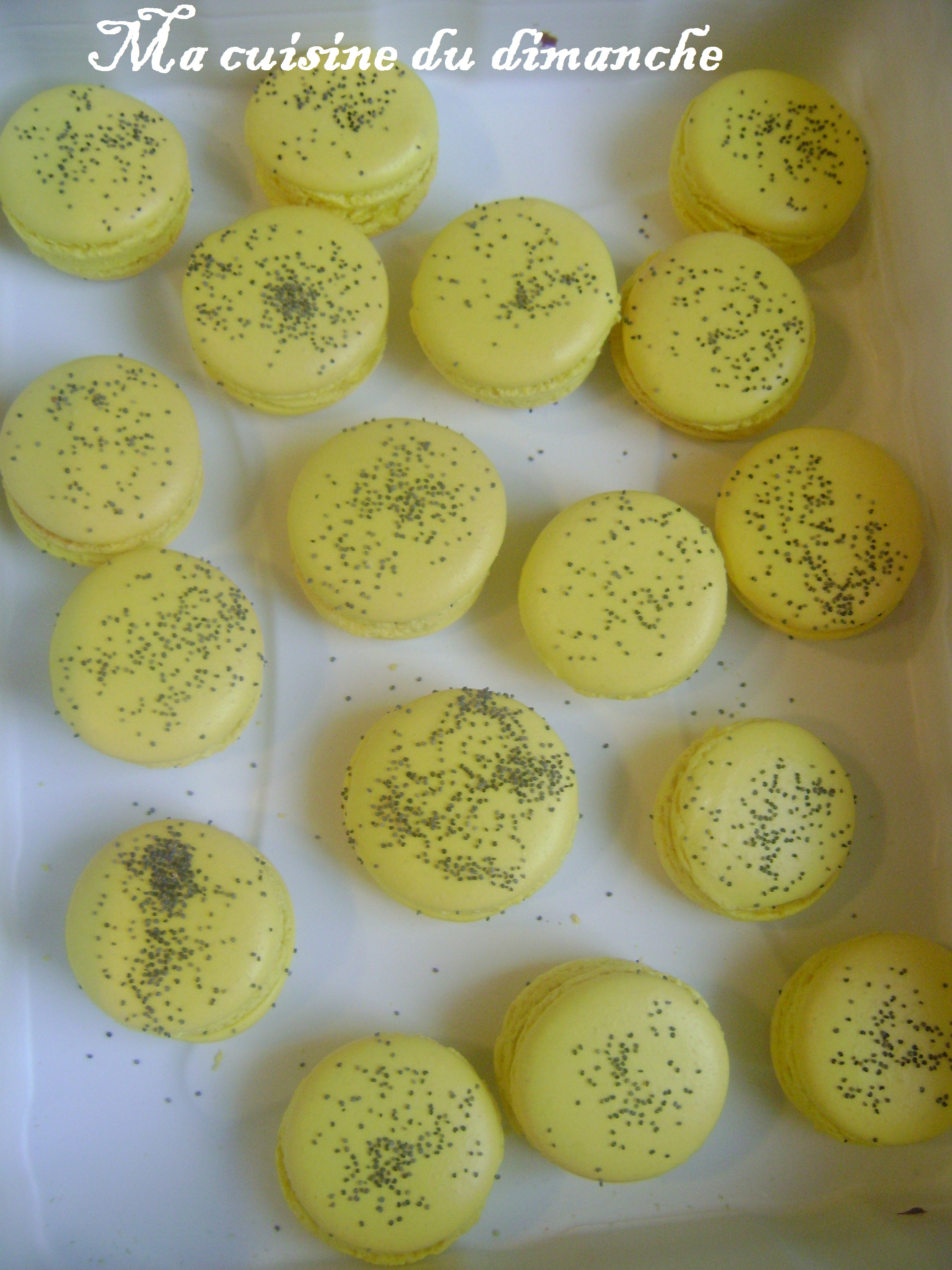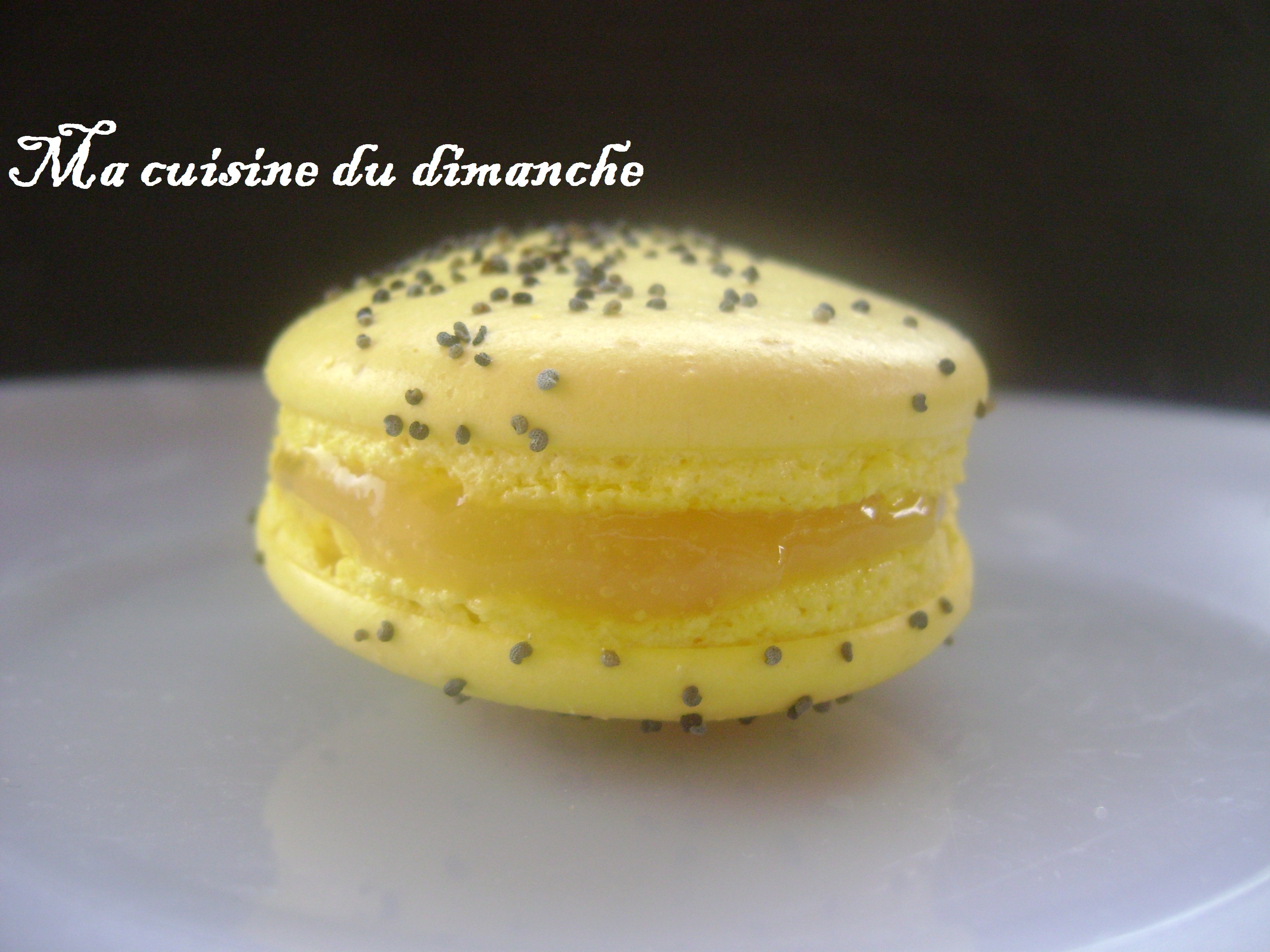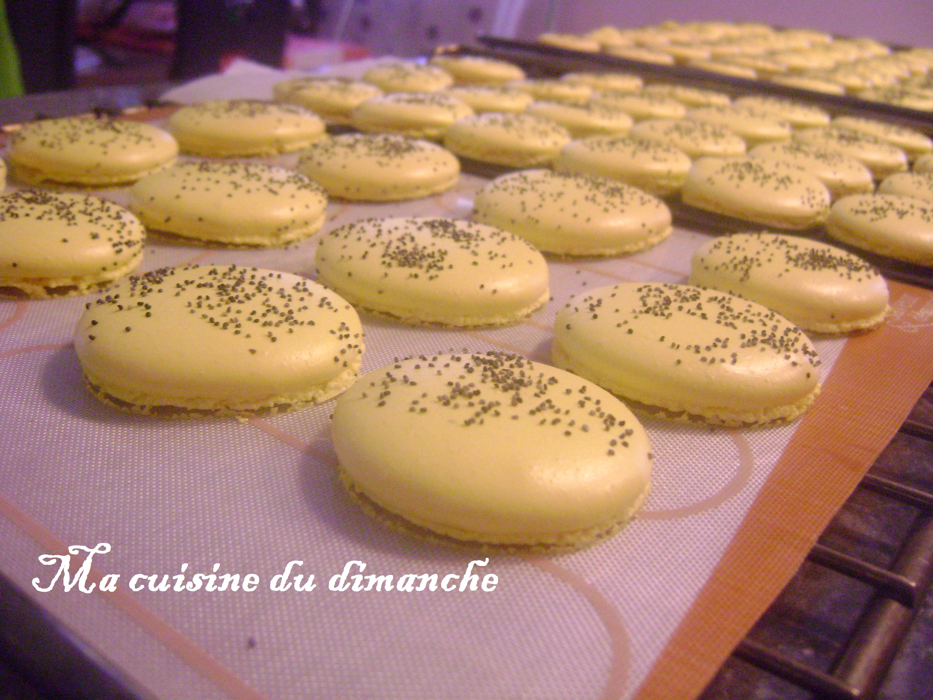 La recette de base des macarons est la même que CELLE-CI, j’ai simplement saupaudré des graines de pavot sur les macarons avant de les enfourner.