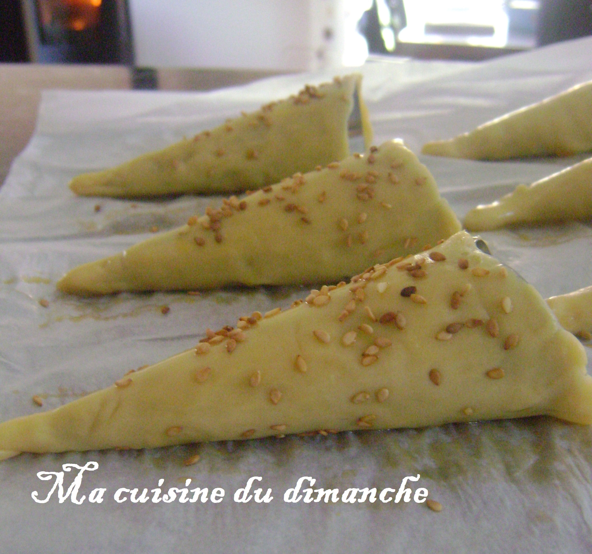 - Badigeonner les cornets avec un peu de jaune d’oeuf et déposer quelques graines de sésame si vous le souhaitez.