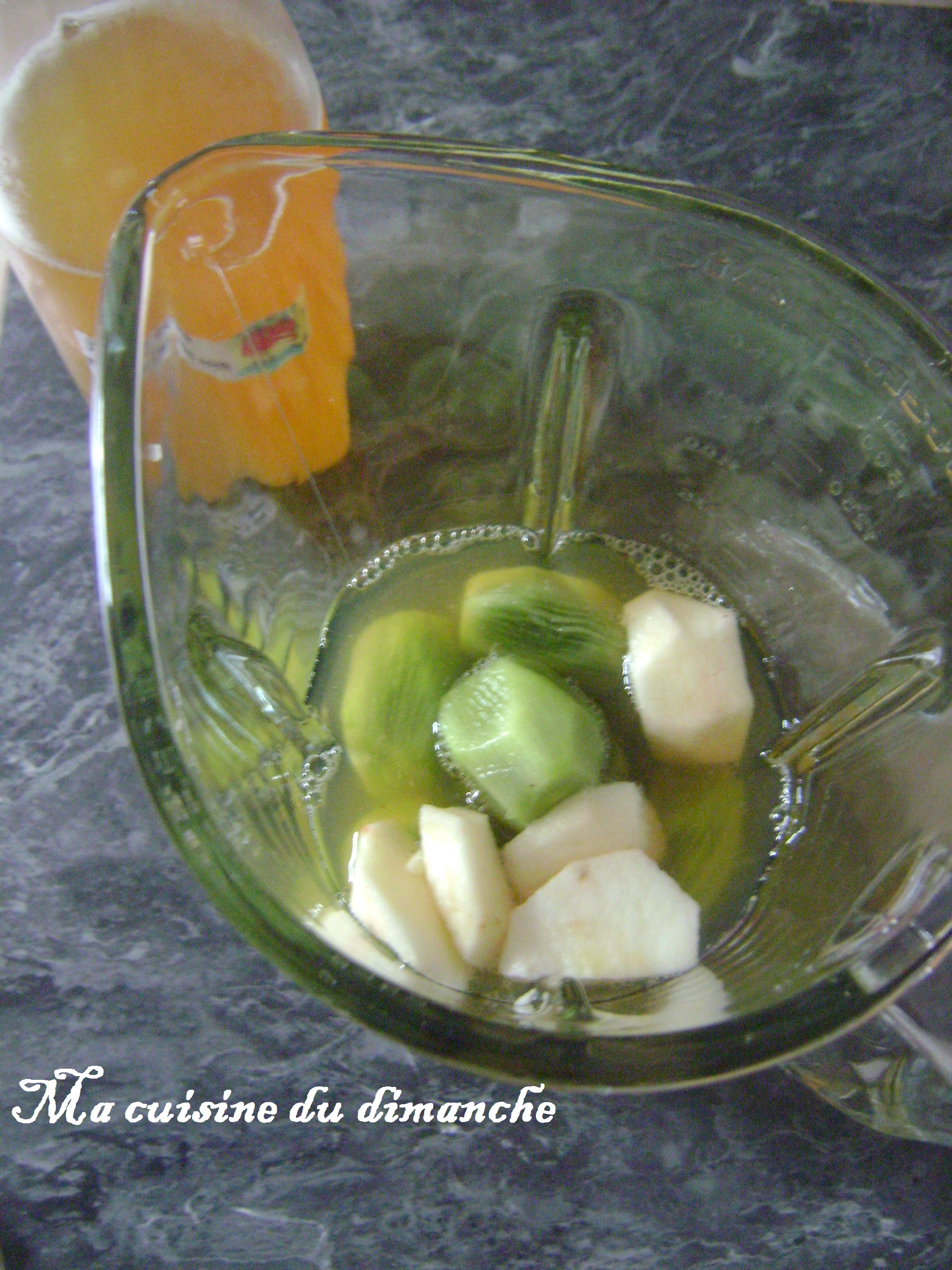 - Les mettre dans le blender avec le jus de pomme et mixer le tout jusqu’à obtenir une jus de fruit (un peu épais)
