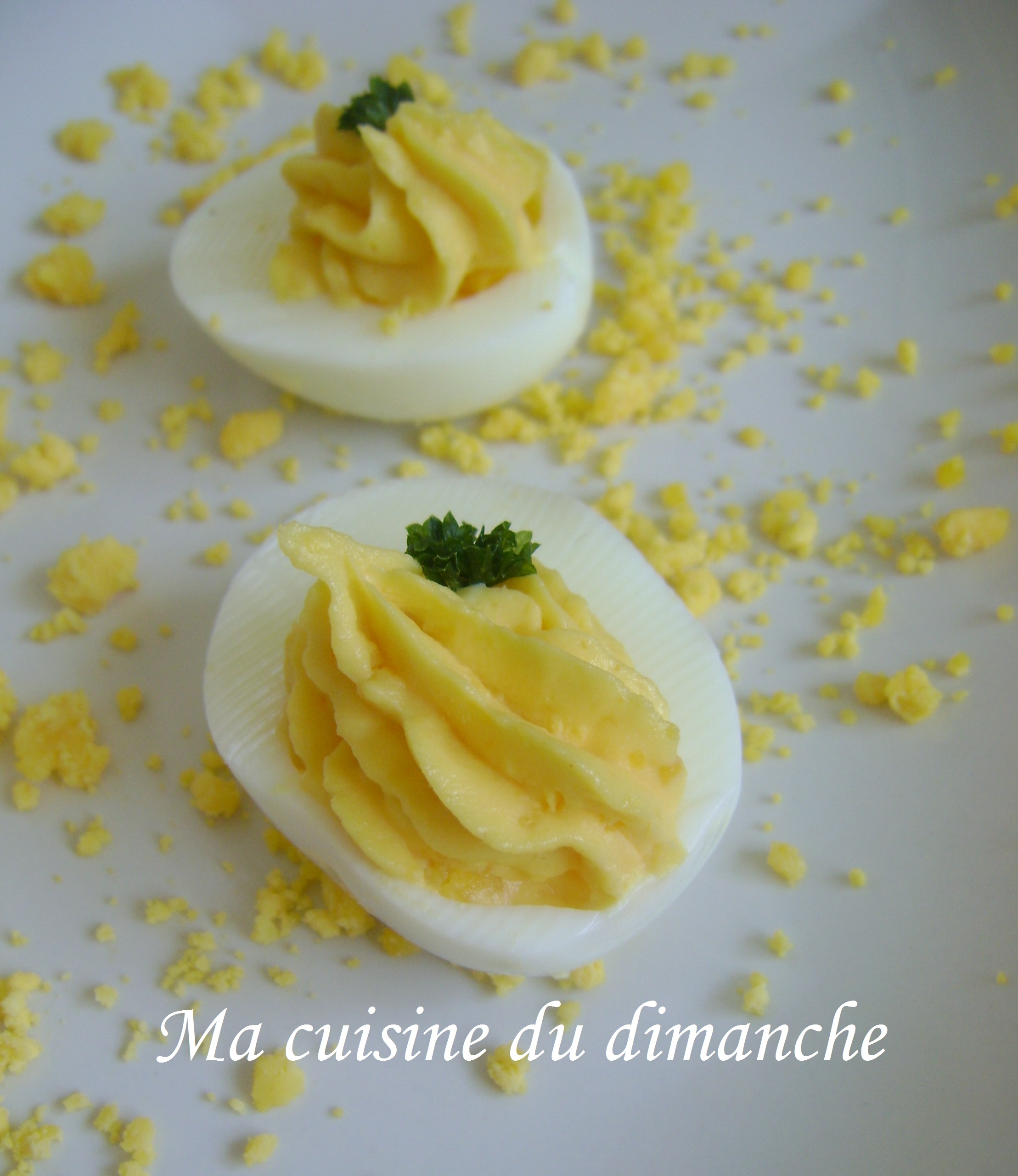 - Remplir les demi-blancs de cette préparation, puis saupoudrer chaque demi-oeuf du reste de jaunes émiettés (ce qui fait le mimosa !!).Servir frais.