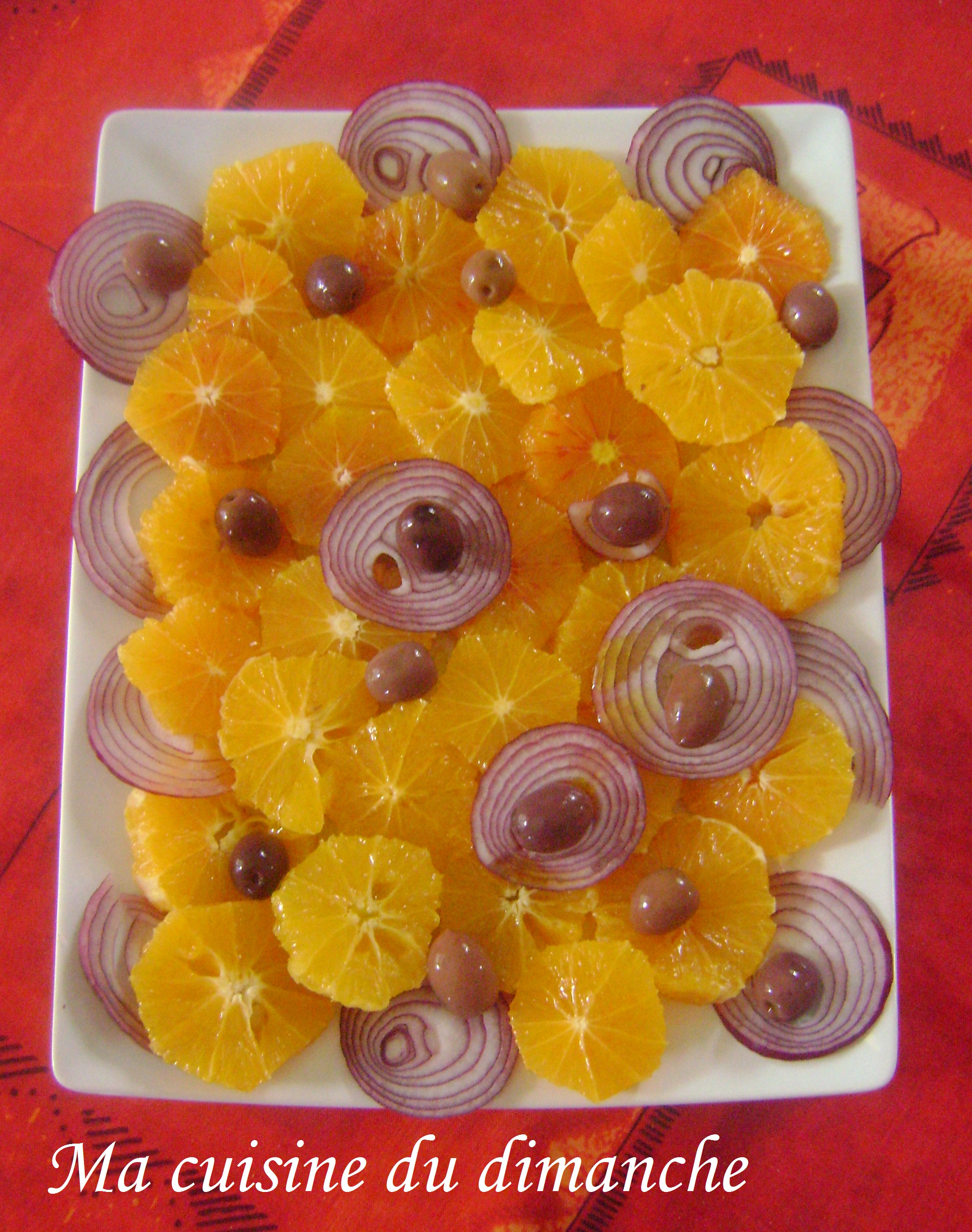- Couper l’oignon rouge en rondelles et les déposer sur les oranges.