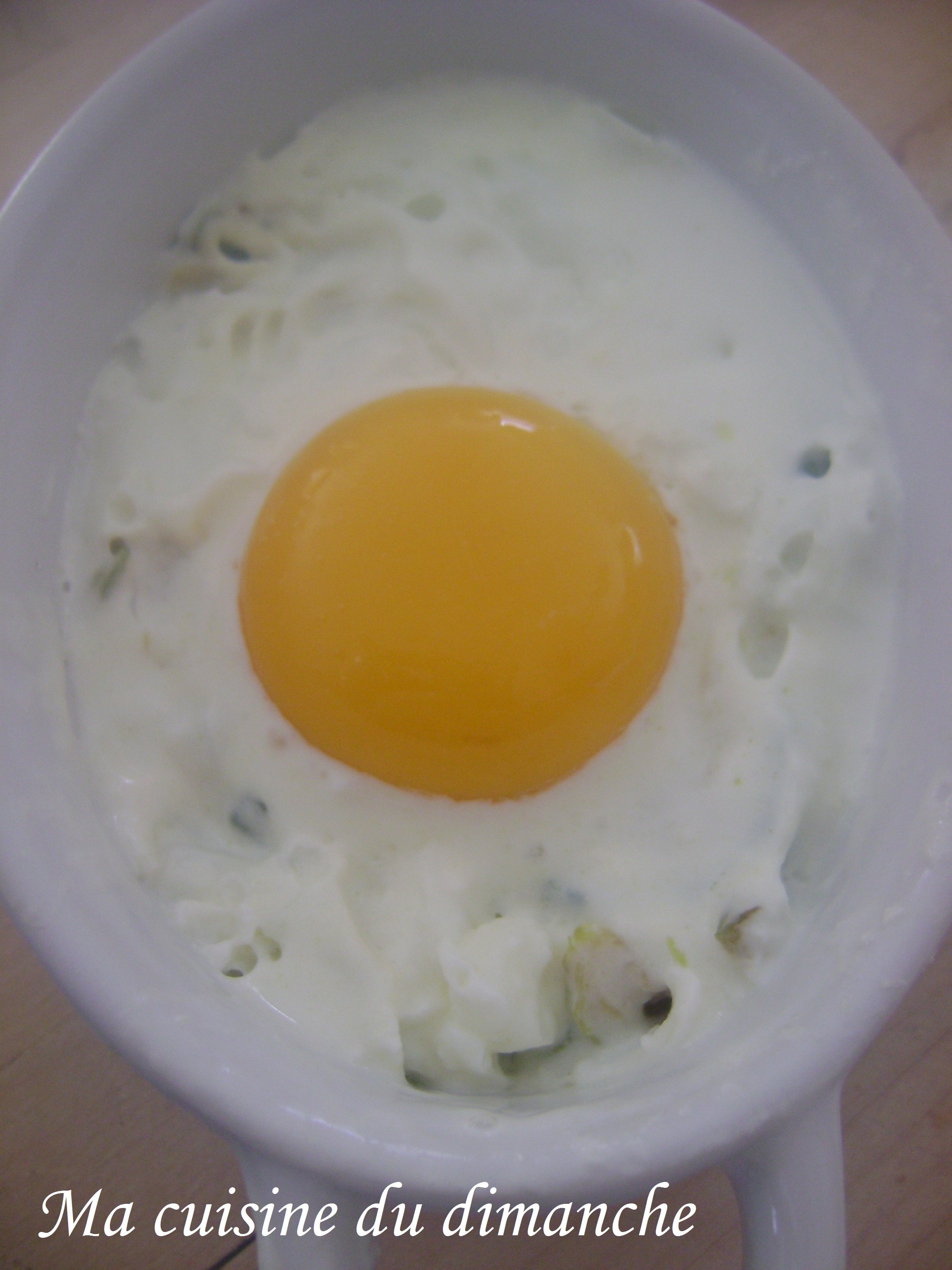 Vous n’avez vraiment pas de temps, voici une variante encore plus rapide : vous placez tout ça au micro-onde (sans le jaune que vous conservez à part) et vous faites cuire pendant 2 minutes (variable en fonction de la puissance du micro-ondes). Quand le blanc a coagulé, c’est prêt ! Déposer ensuite le jaune d’oeuf cru dessus (ou si vous le préférez un peu cuit, il faudra le rajouter quelques secondes avant la fin de la cuisson)