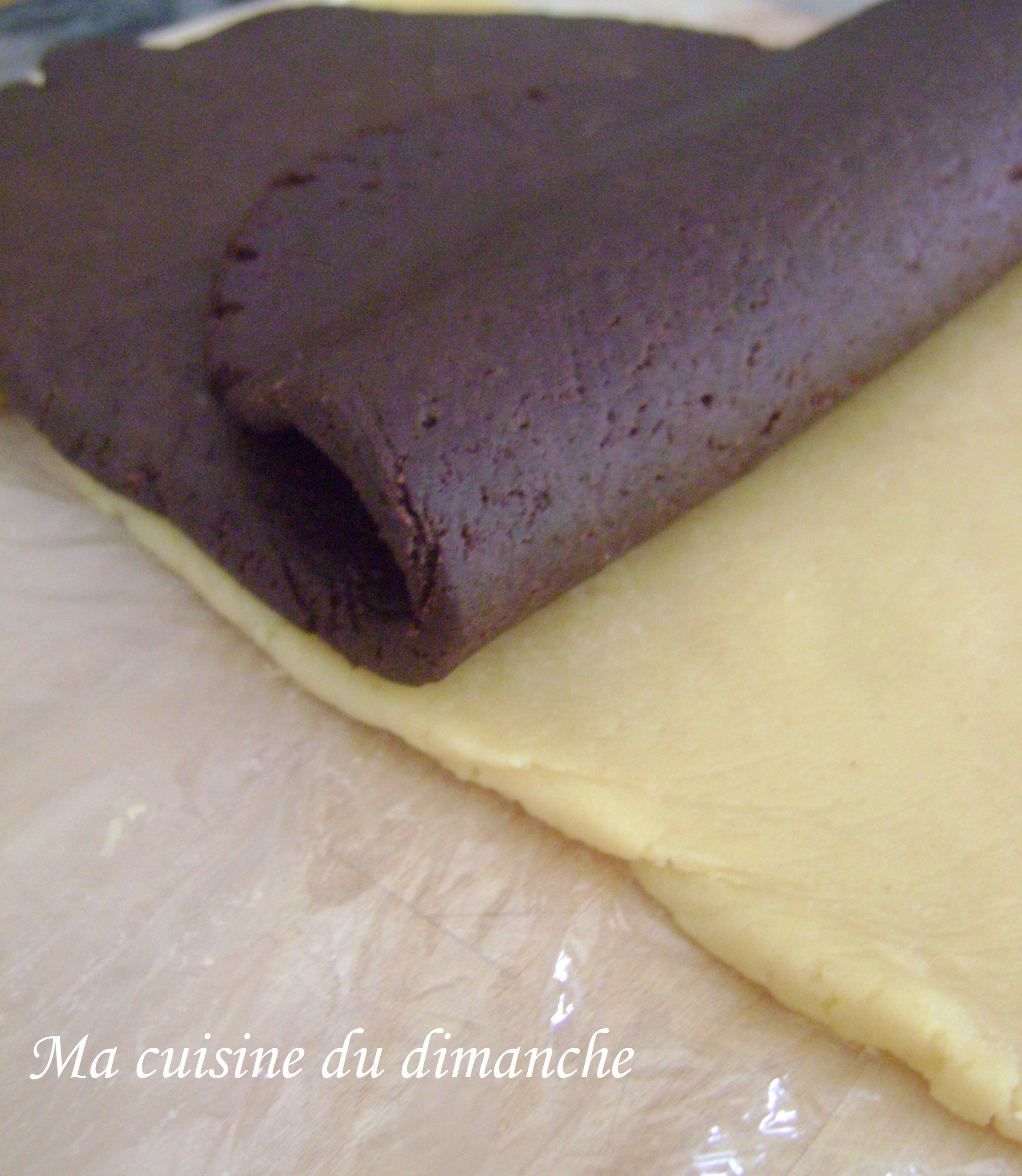 - Superposer les deux pâtes l’une sur l’autre et rouler (comme pour faire un gâteau roulé).