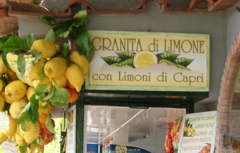 Ceux qui me suivent depuis quelques temps savent (et oui je me répète) que la meilleure granita au citron, je l’ai mangée non pas en Sicile mais à Capri dans le petit kiosque ci-dessous qui proposait des granite al limone faites avec les énormes citrons que l’on voit sur la photo (et oui la côte Amalfitaine regorge aussi de magnifiques citrons).