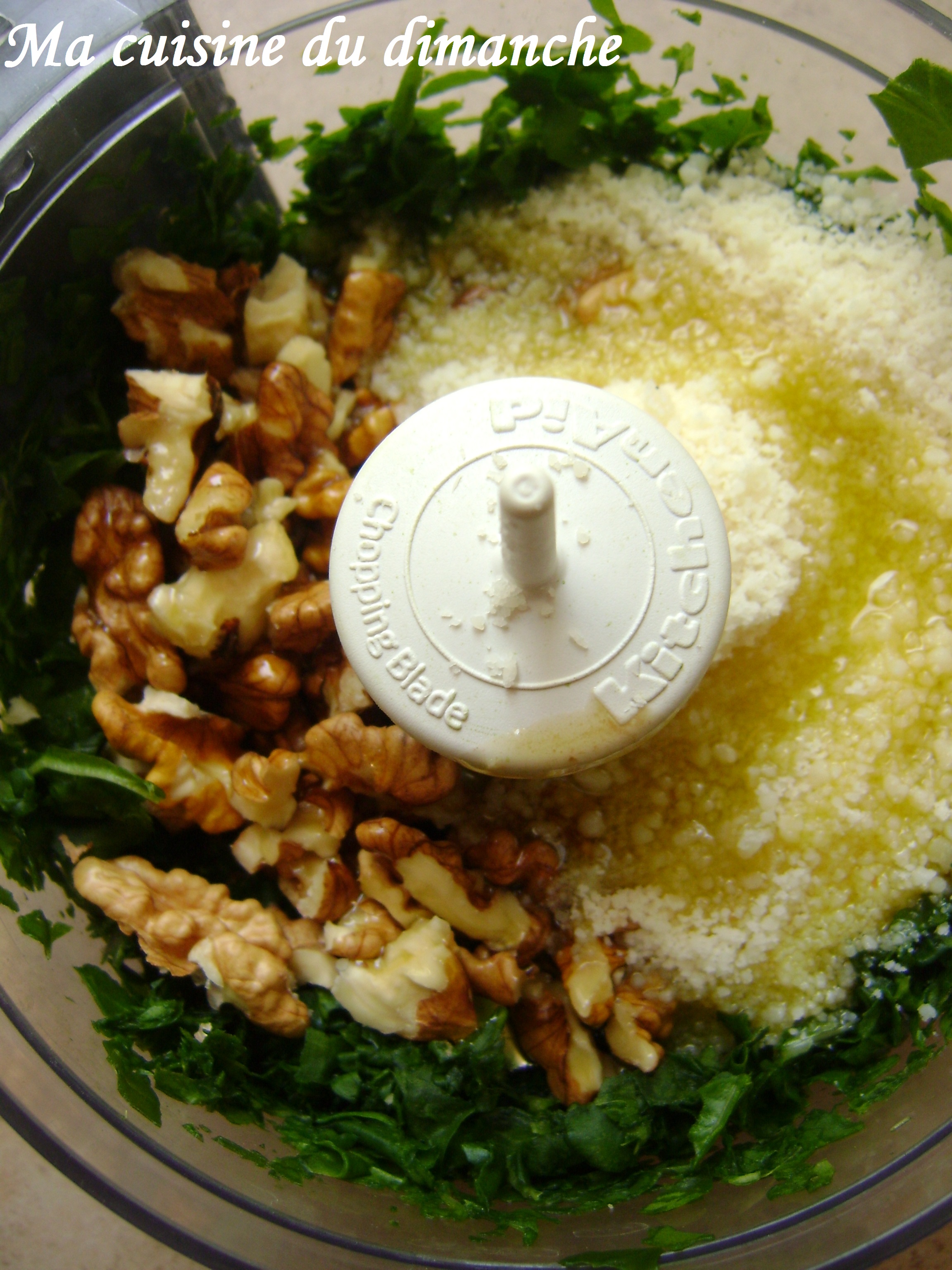 Quand on parle de Pesto, la première recette qui nous vient à l’esprit est celle du Pesto le plus connu, celui de la région de Gêne, le fameux Pesto alla genovese confectionné avec des feuilles de basilic, des pignons de pin, du parmesan, de l’ail et de l’huile d’olive. Mais une fois qu’on a compris le principe de cette sauce, il devient ultra simple d’obtenir un nouveau pesto. On choisit une herbe aromatique et un fruit sec qui nous plait, on ajoute du parmesan, on arrose le tout généreusement d’huile d’olive, on mixe l’ensemble et hop le tour est joué ! C’est ce qui est sympa avec le principe de la sauce Pesto, on peut laisser libre court à notre créativité et tenter de nouvelles recettes. C’est ce que j’ai fait avec mes feuilles de blettes, il me restait aussi quelques noix, alors je me suis dit « pourquoi pas ? »