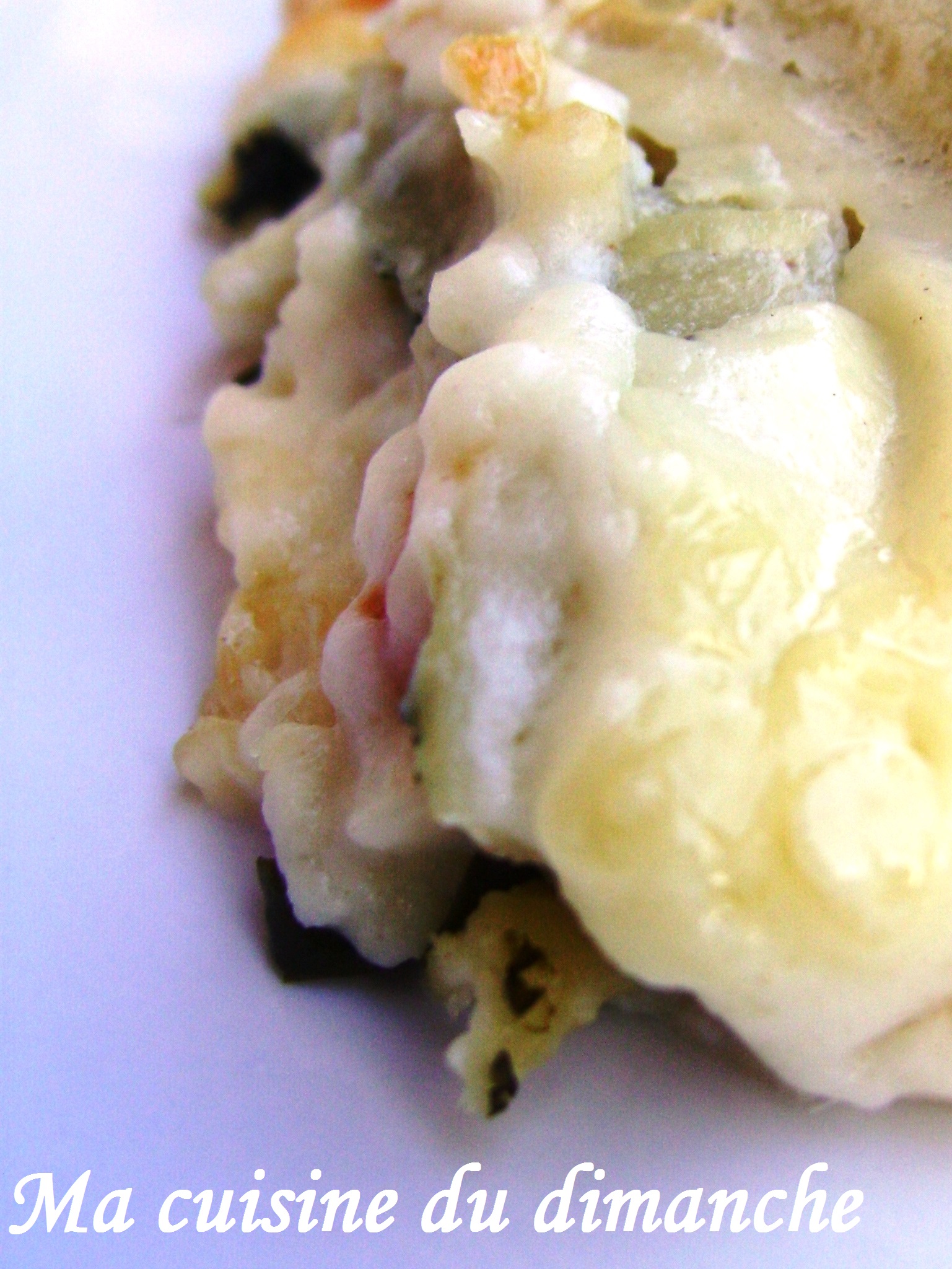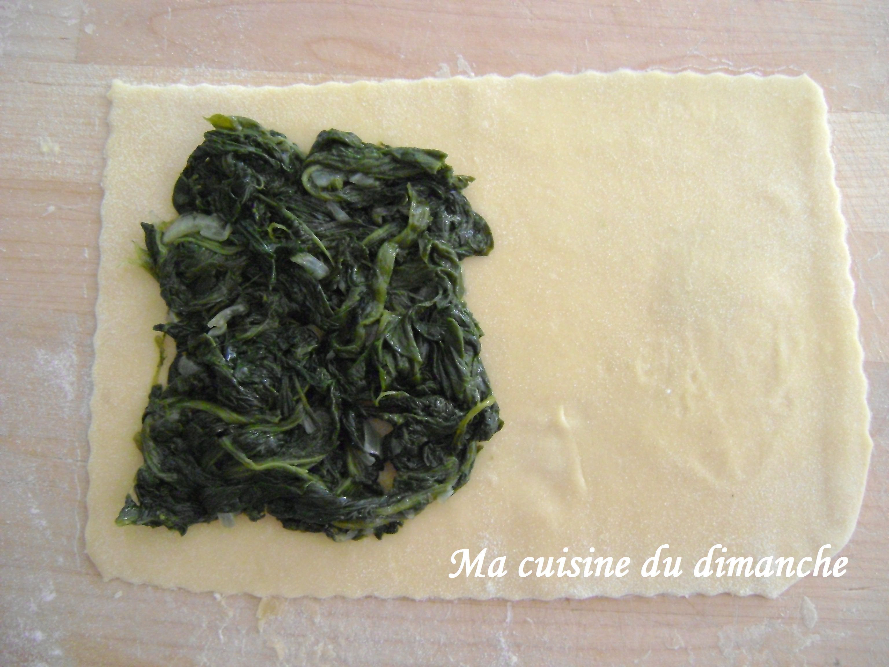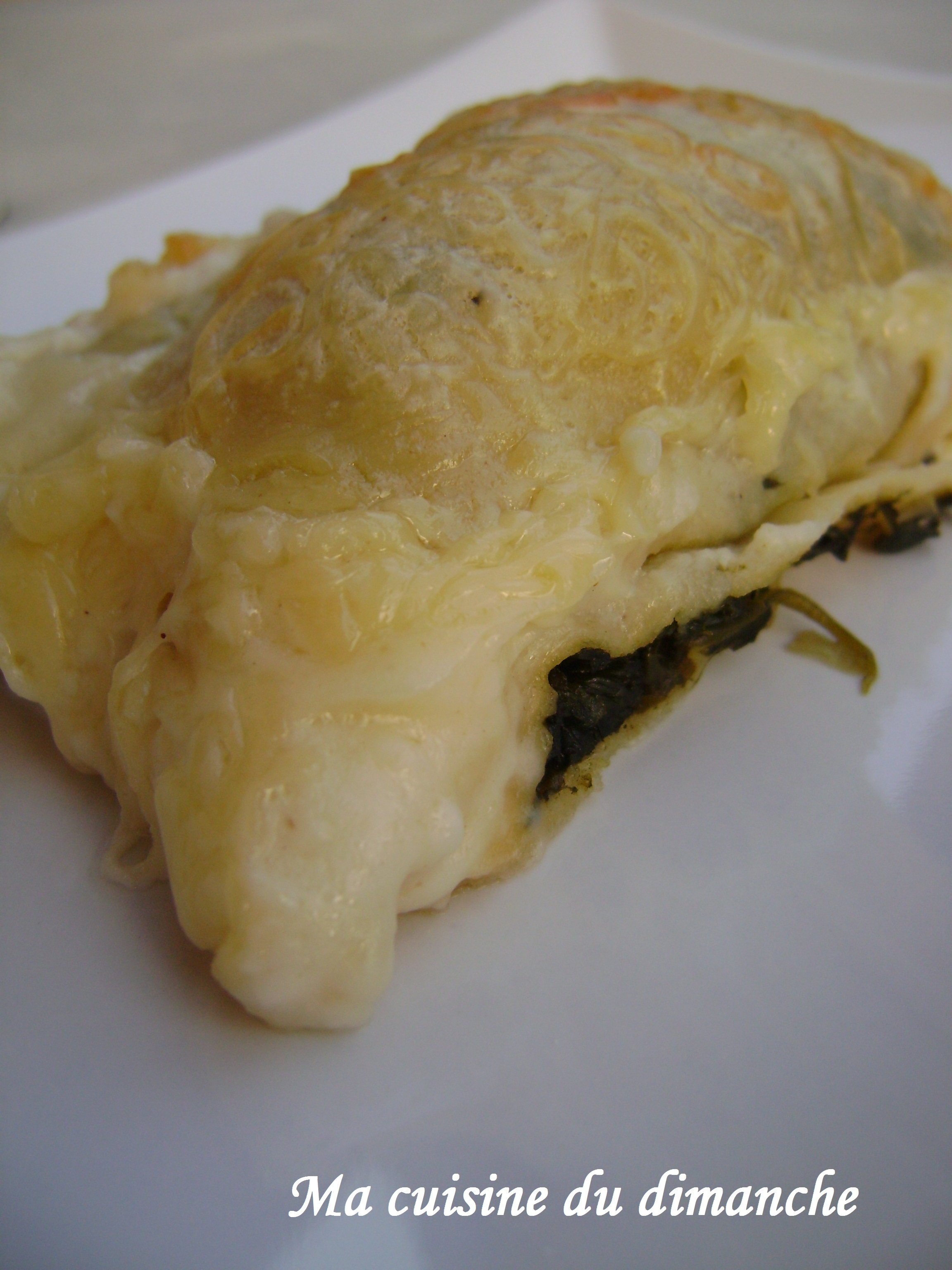 Personnellement, j’ai adapté la recette et je la réalise comme je l’aime, c’est à dire sous forme de chaussons individuels avec une base de pâte à lasagne (« maison » c’est bien meilleur !) que je garnis d’une farce d’épinards en branche cuits à l’huile d’olive et d’oignons rissolés. Je recouvre le tout d’une sauce béchamel et d’Emmental et je fais gratiner au four.