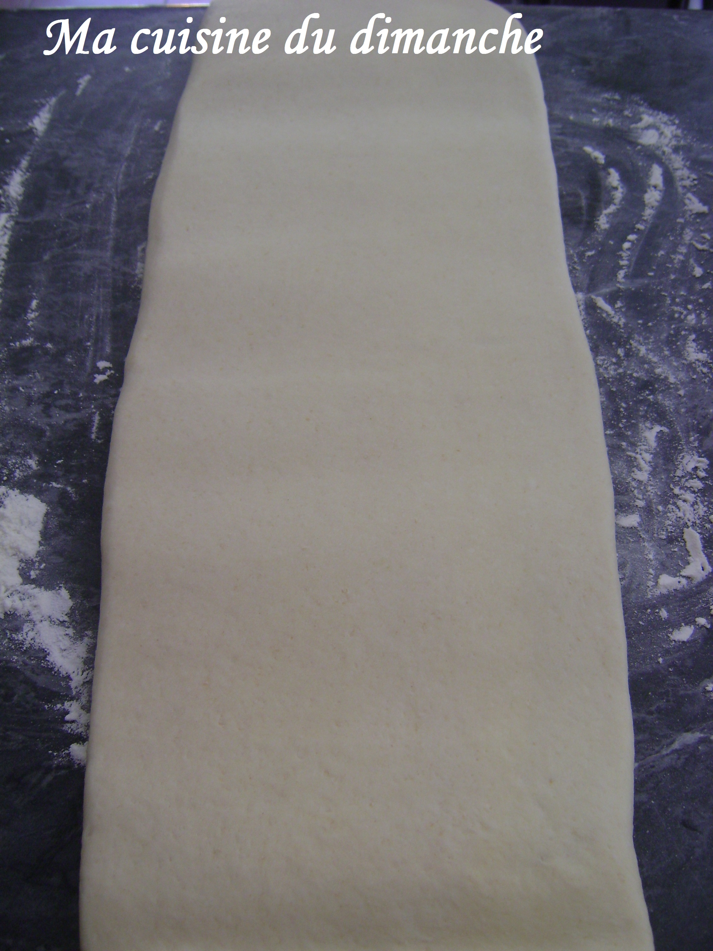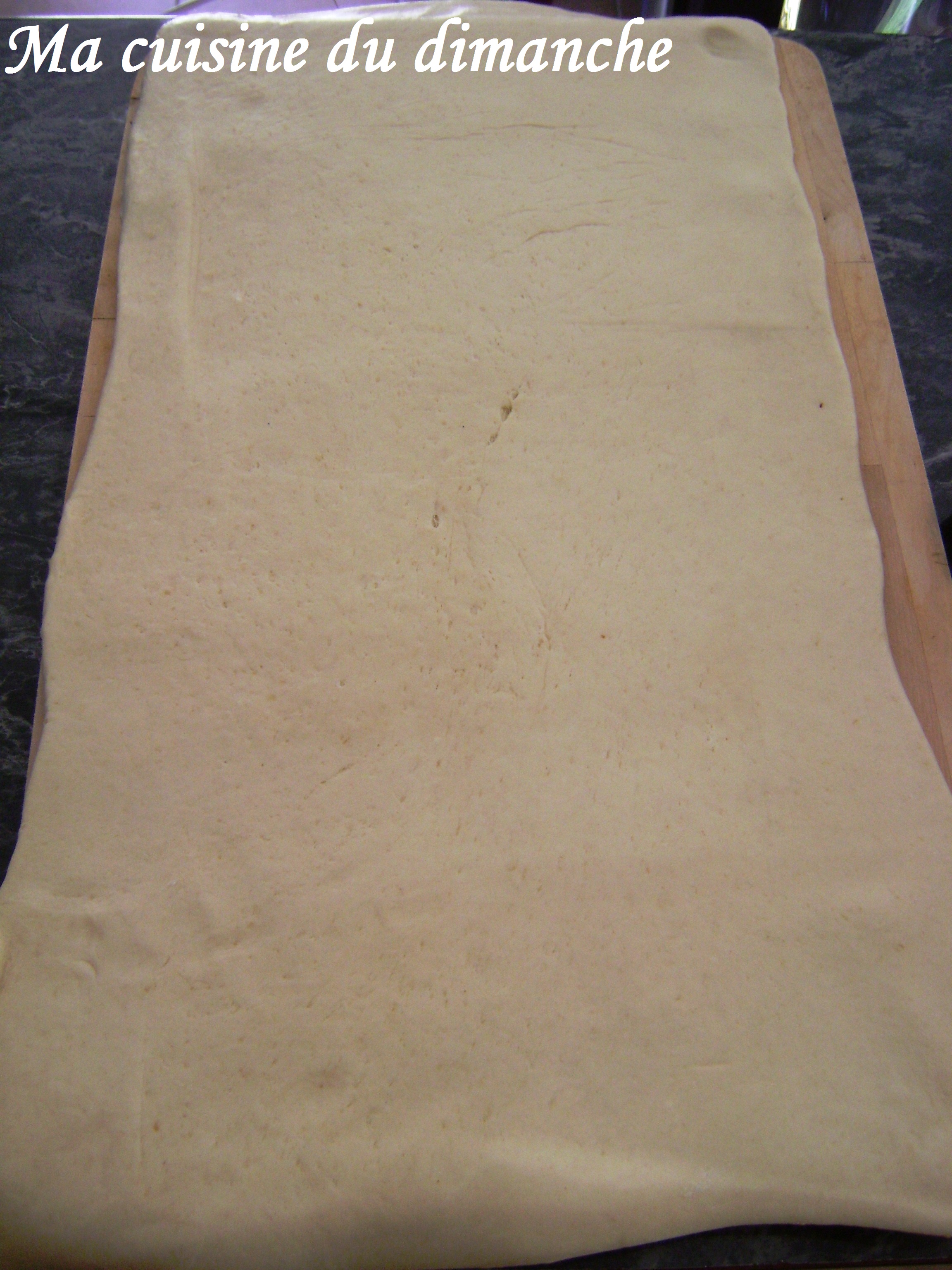- 1 heure plus tard, déposer la pâte sur votre plan de travail (légèrement fariné), en mettant la pliure à droite (et la fermeture à gauche donc) et l’étaler pour former un nouveau rectangle de 6 mm d’épaisseur.