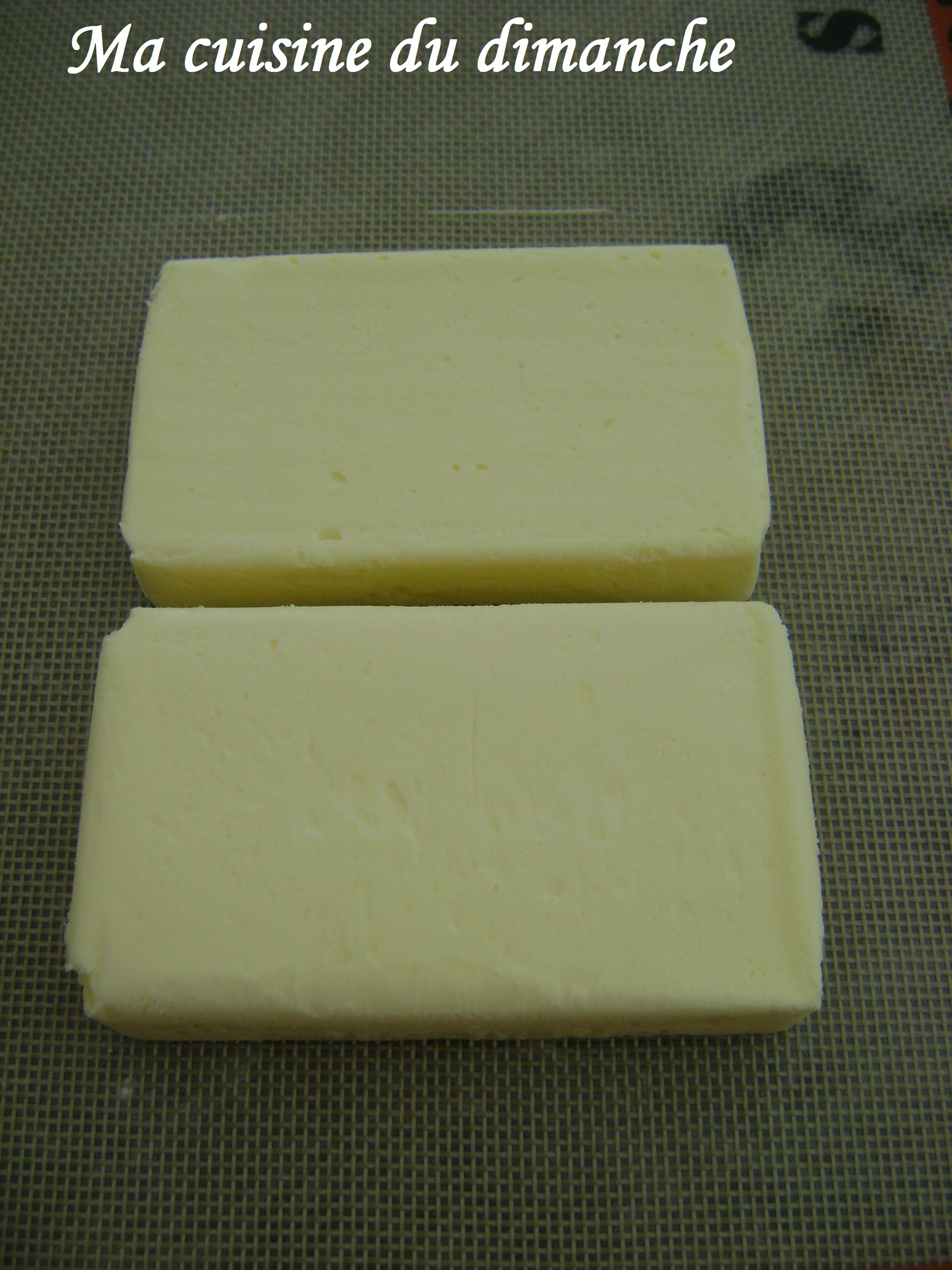 - Couper la plaquette de beurre dans le sens de la longueur, en 2 morceaux identiques et la placer sur un tapis en silicone (vous pouvez aussi le faire sur un autre support (papier sulfurisé, etc …). Je vous conseille un support qui n’adhère pas trop, car il faudra ensuite déposer le beurre étalé sur la pâte, il faut donc choisir un support qui se détache facilement.