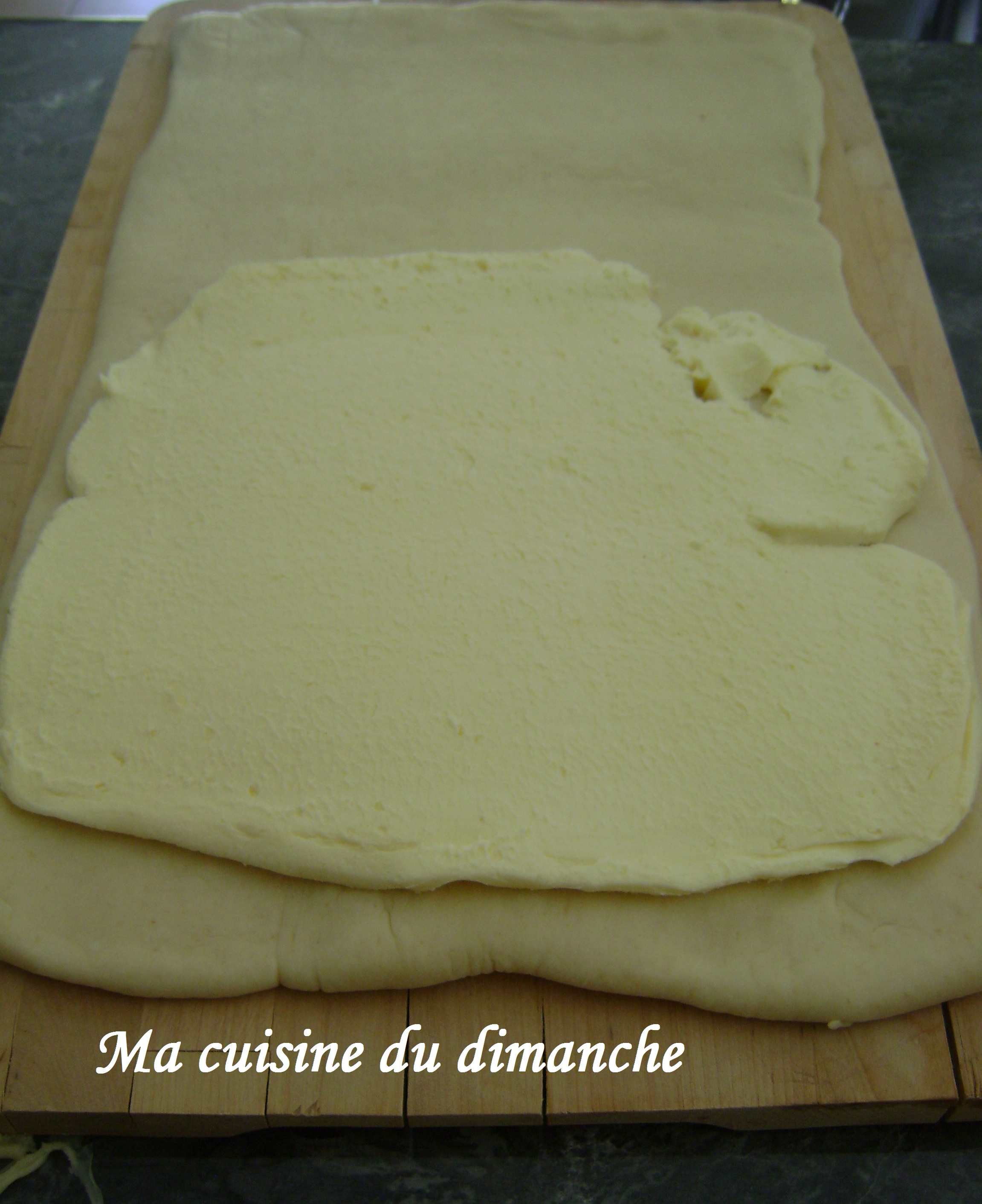 - Etaler de nouveau votre pâte (qui contient le beurre à l’intérieur) et former un rectangle. Essayer dans la mesure du possible de bien répartir le beurre sur toute la surface. Ne travailler pas trop la pâte sinon le beurre va chauffer.