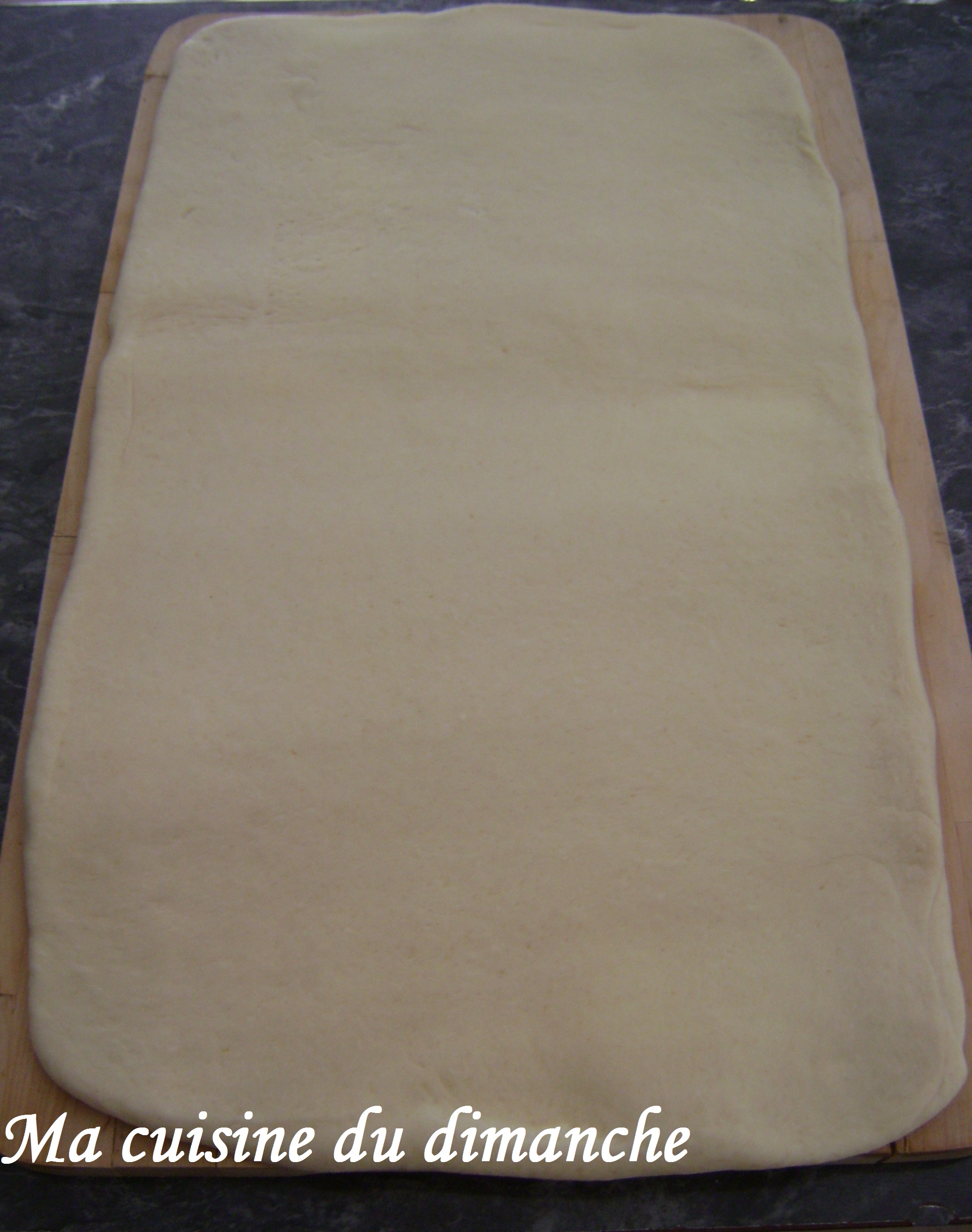 - 2 heures plus tard, sortir la pâte et l’étaler sur une planche très légèrement farinée (il faut rajouter le minimum de farine possible pour ne pas changer la composition de la pâte).