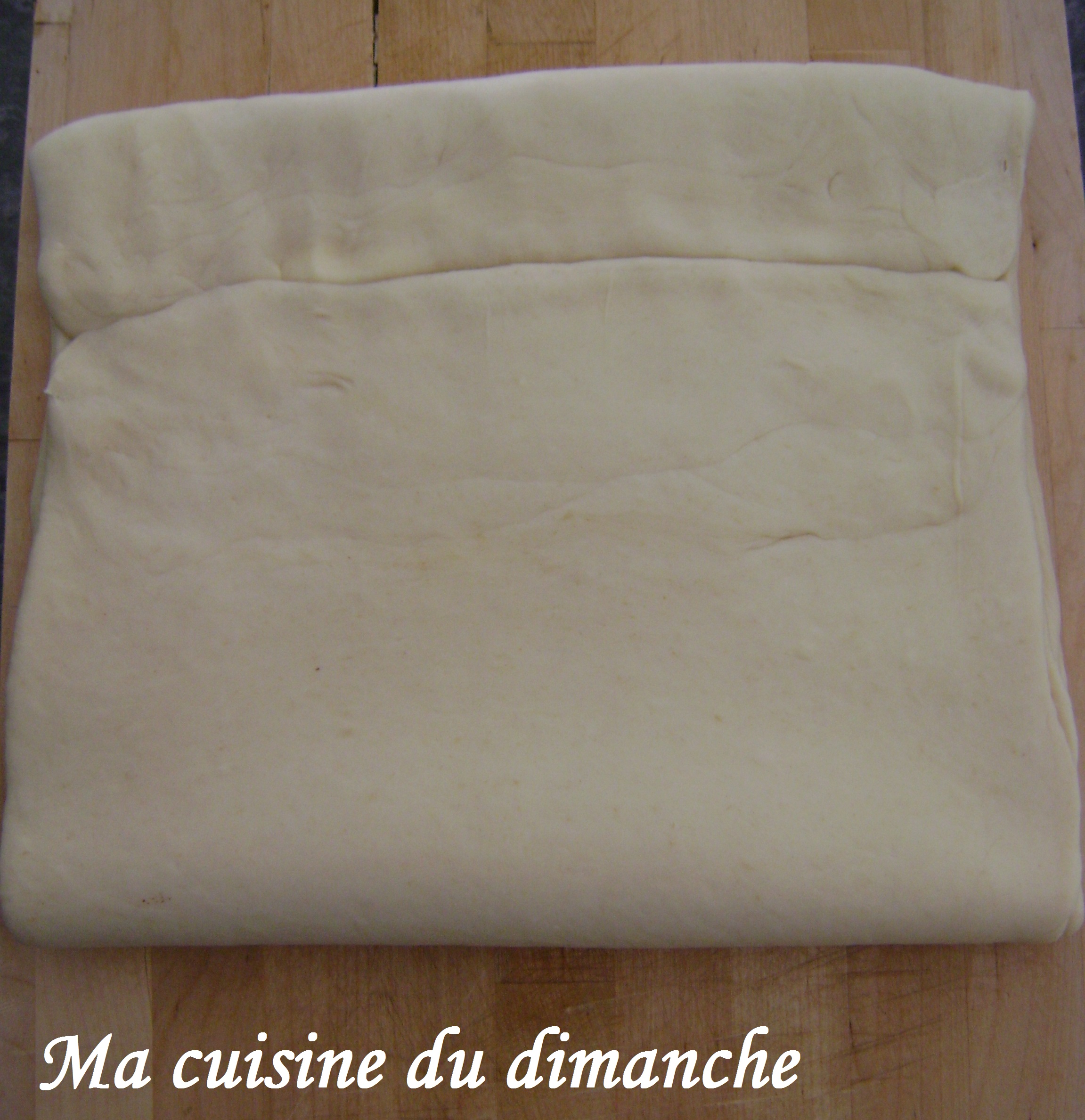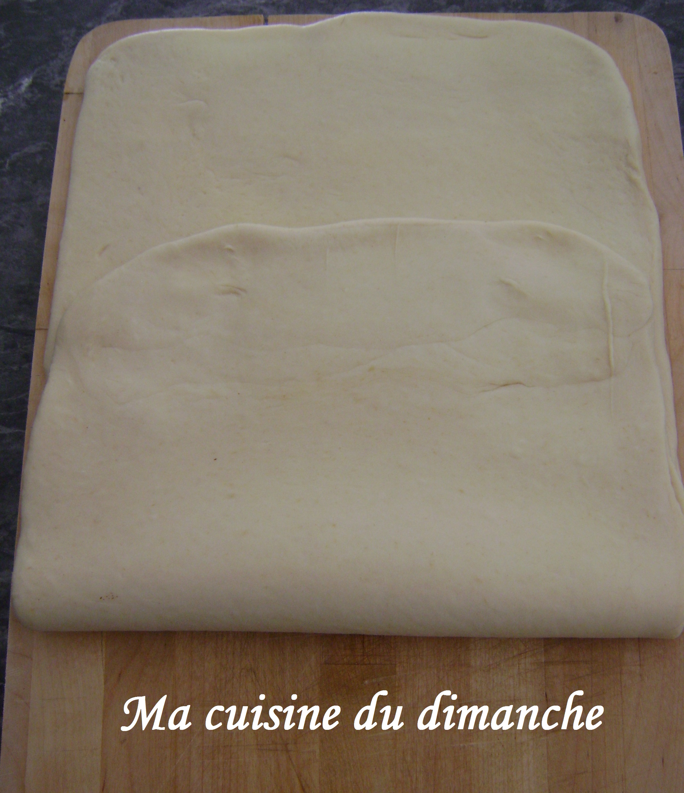 - La pliure est en haut et la fermeture en bas (comme sur la photo ci-dessus). Il faut maintenant faire pivoter la pâte d’un quart de tour pour que la pliure se retrouve à gauche et la fermeture à droite.