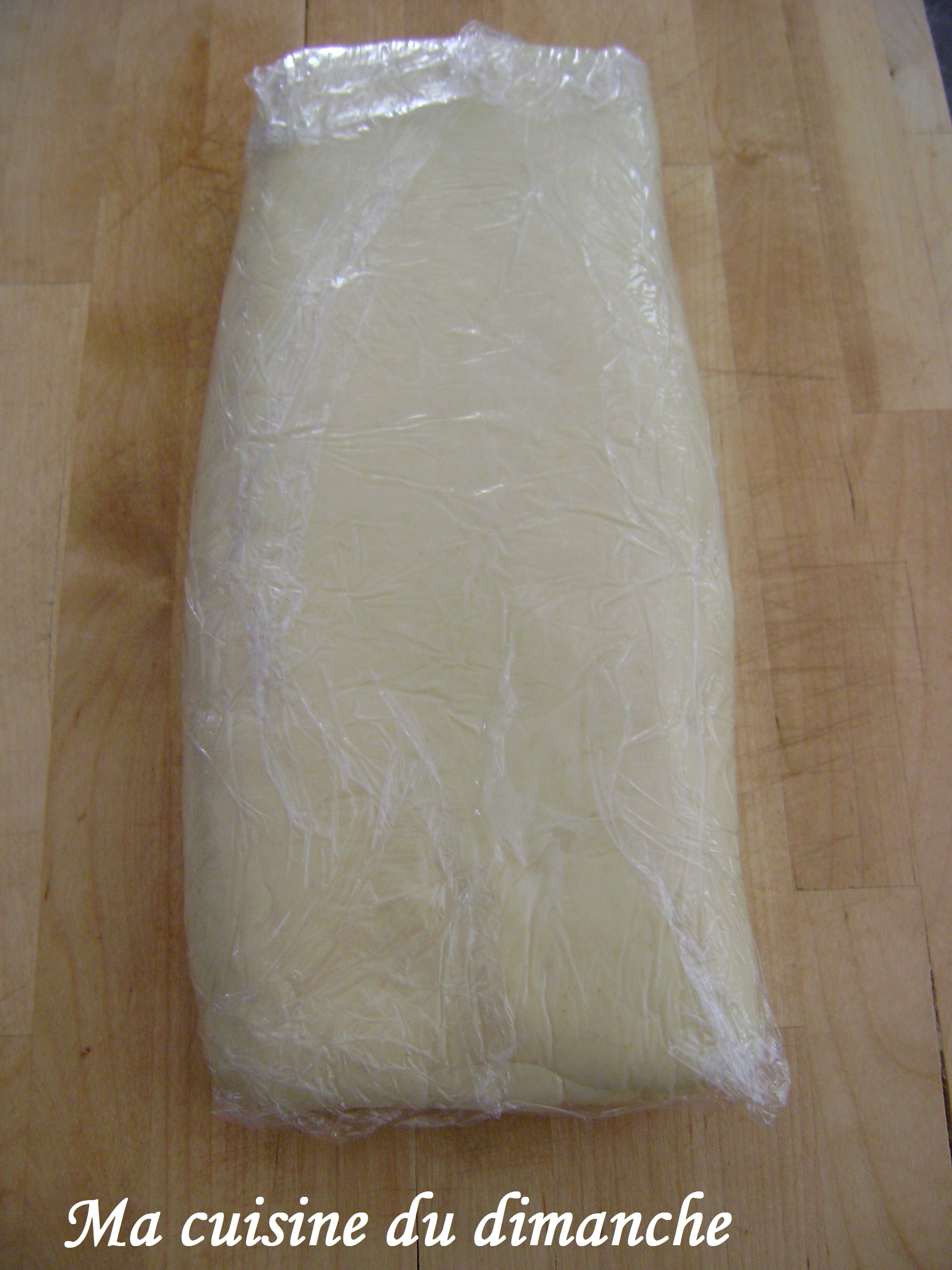 - La déposer sur une planche et l’étaler rapidement avec les mains pour qu’elle ait une forme rectangulaire, puis la mettre sous film alimentaire et la placer au réfrigérateur pendant 2 heures.