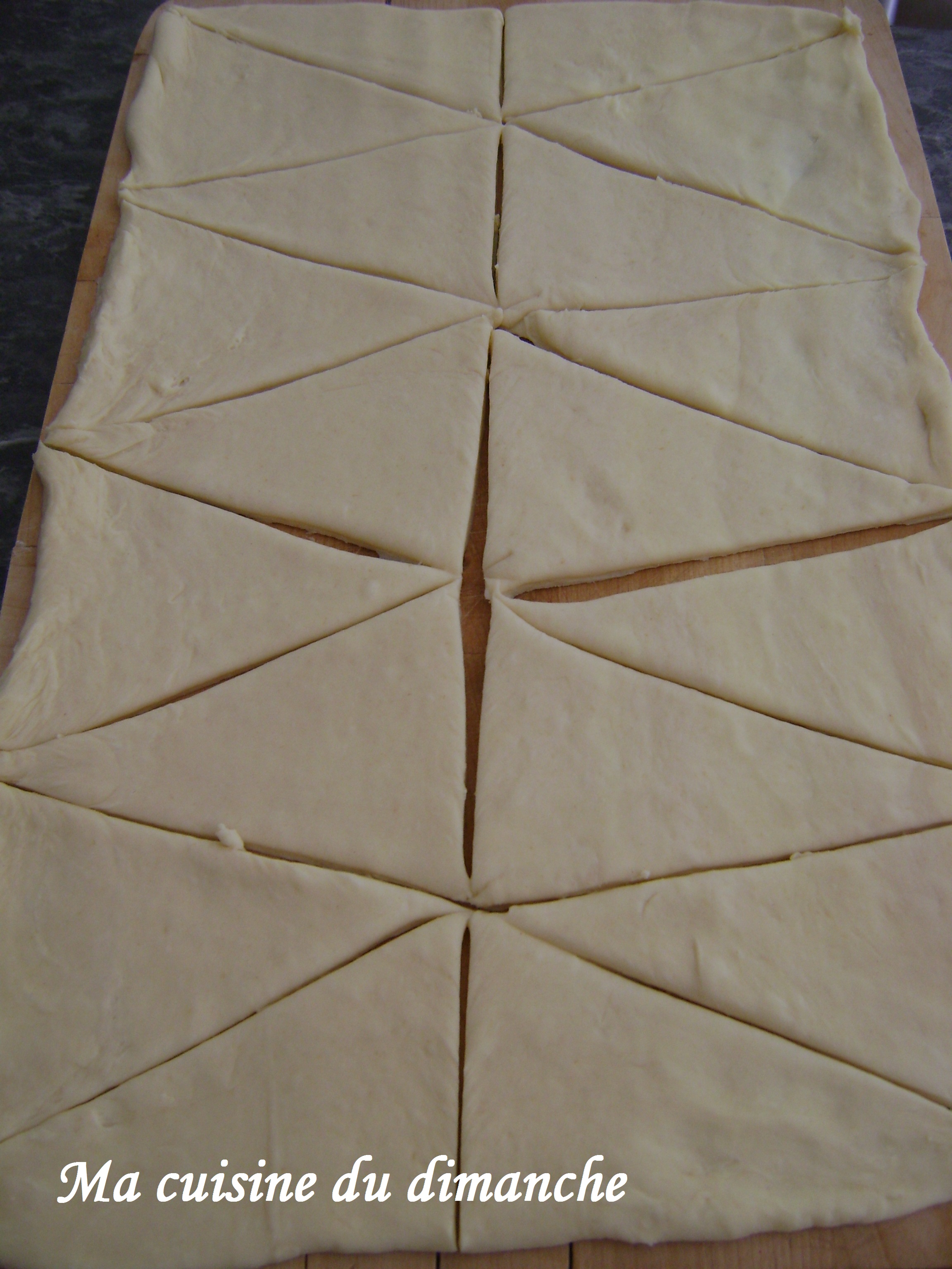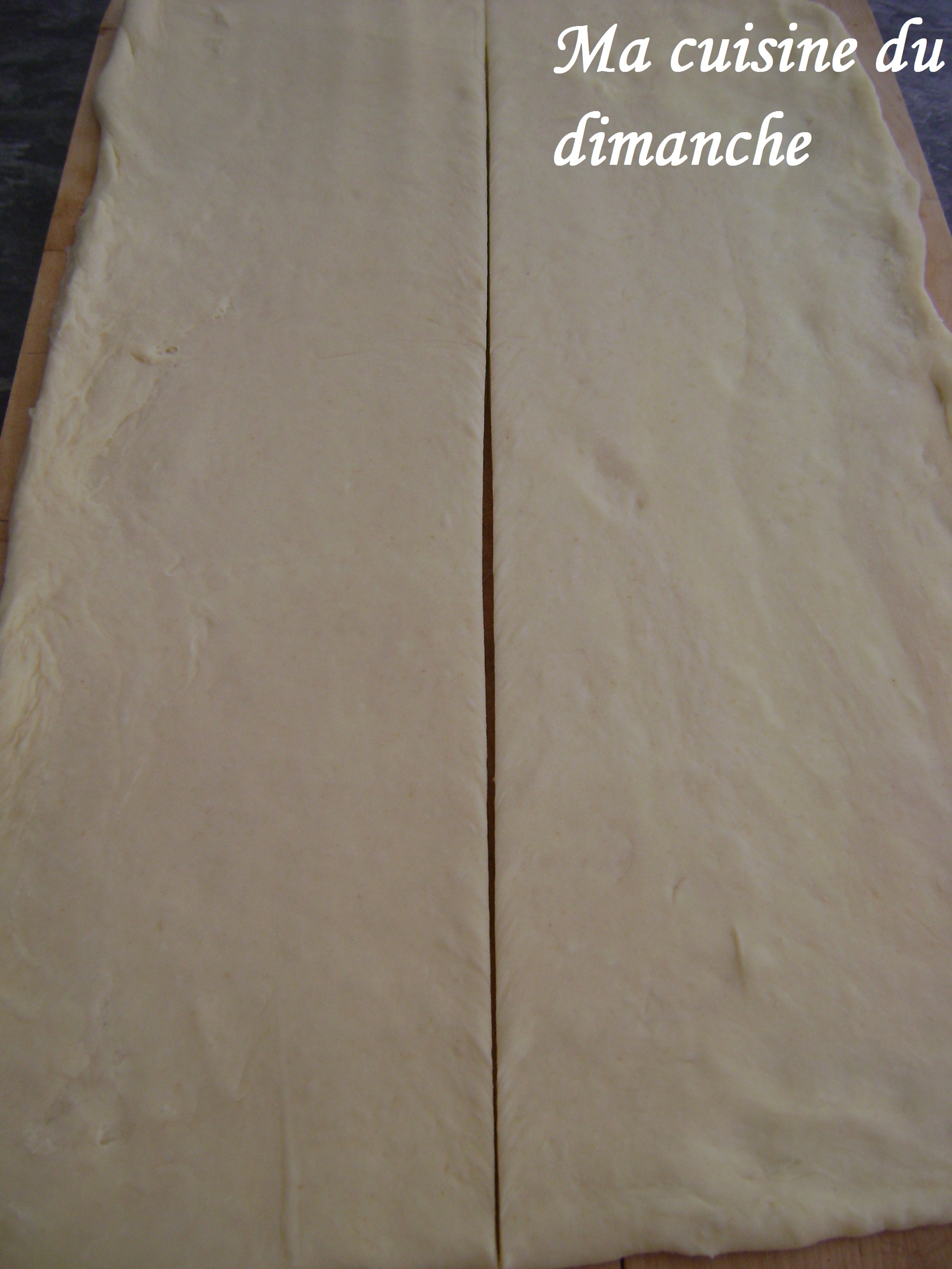 Découper ce rectangle en deux dans le sens de la hauteur (comme nous l’avons fait plus haut pour les croissants), mais au lieu de former des triangles, il faut découper des rectangles de surfaces identiques sur chaque moitié de pâte (on part de la coupure centrale et on coupe jusqu’à l’extrémité (désolée, j’ai oublié de prendre une photo à ce moment-là)