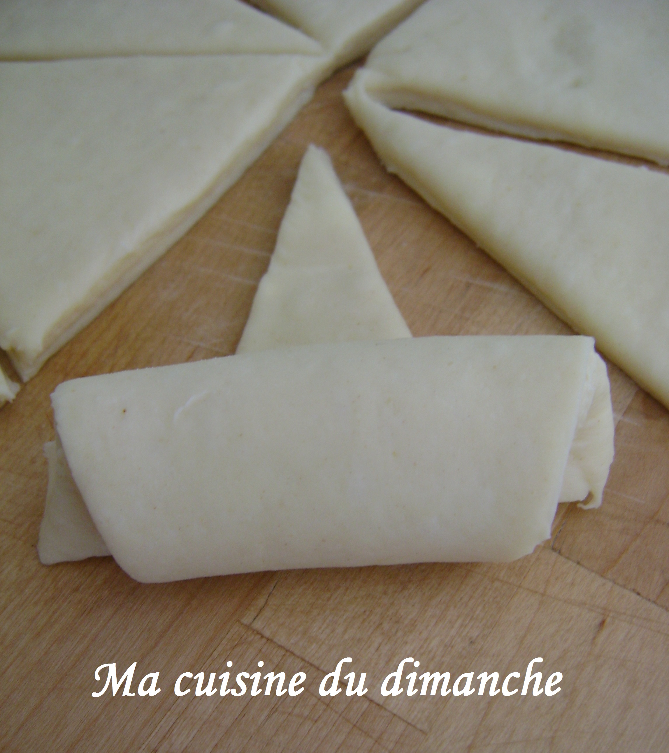 - Avec ces triangles, nous allons pouvoir former des croissants. Pour cela, il faut prendre un triangle et l’enrouler sur lui-même en commençant par sa base (la partie la plus large).