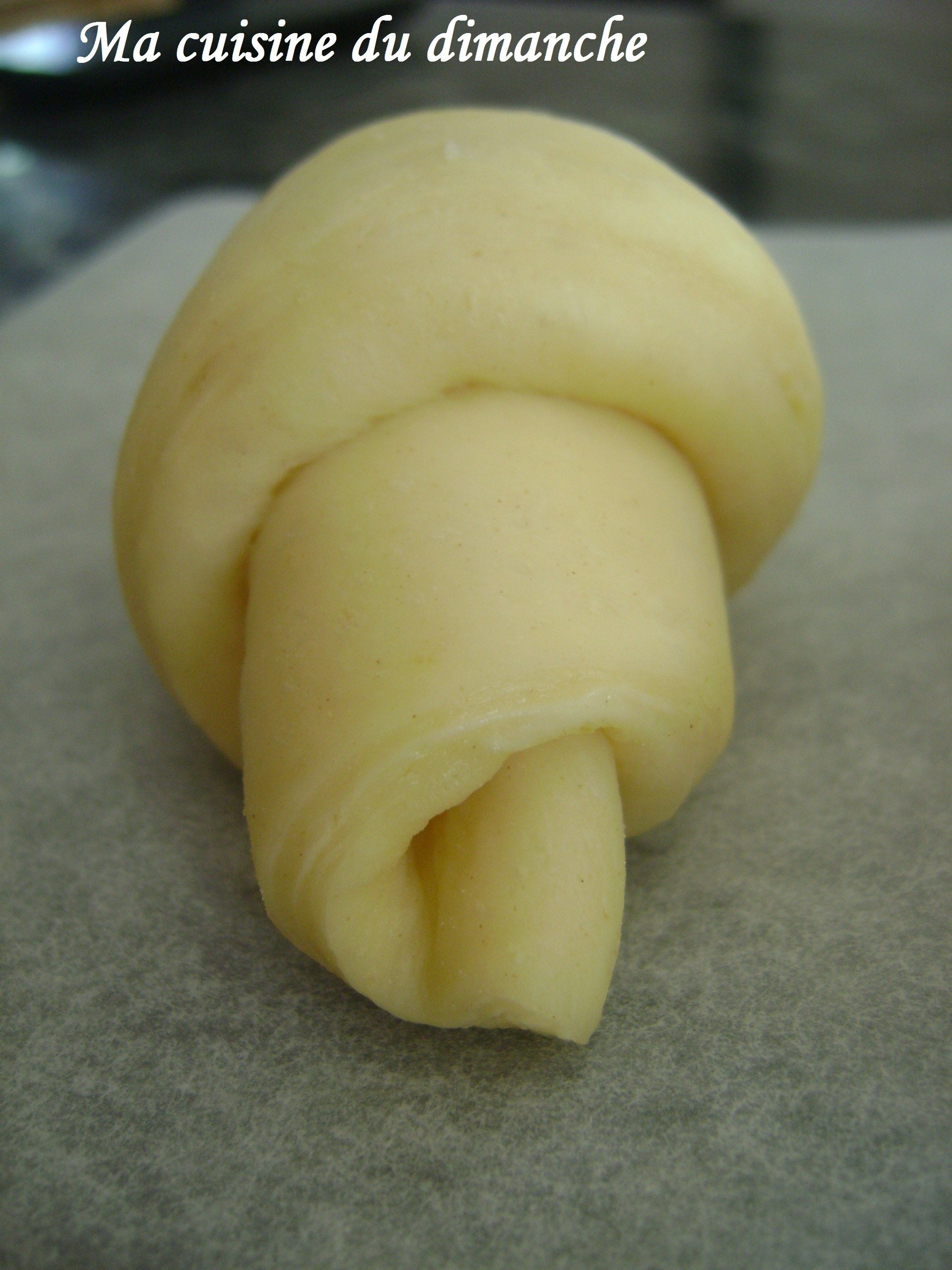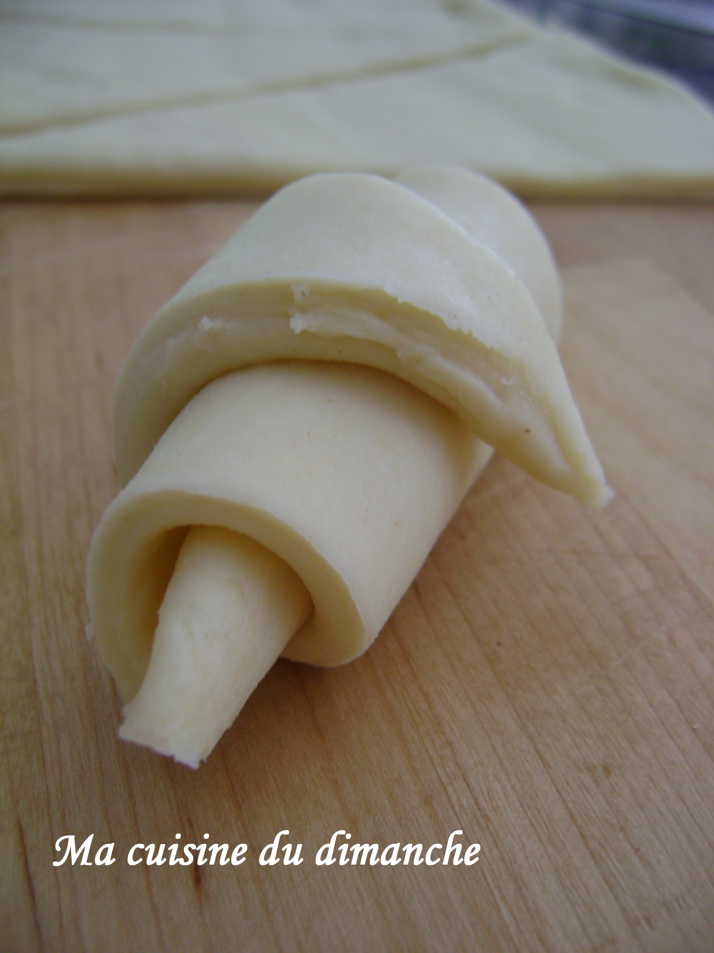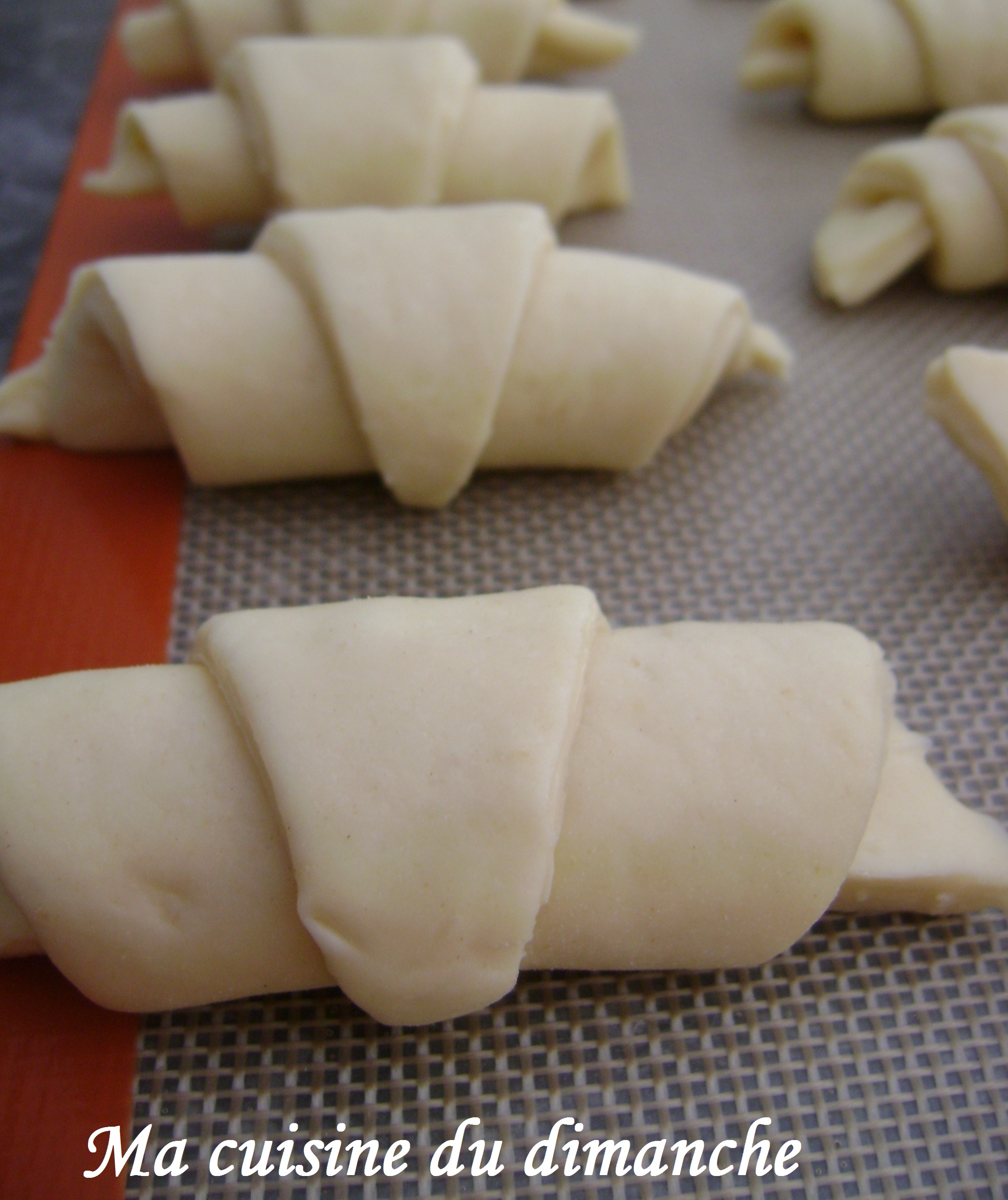 - Une fois le croissant formé, il faut placer la pointe vers le bas et la bloquer sur le tapis de cuisson pour éviter qu’il ne se déroule.