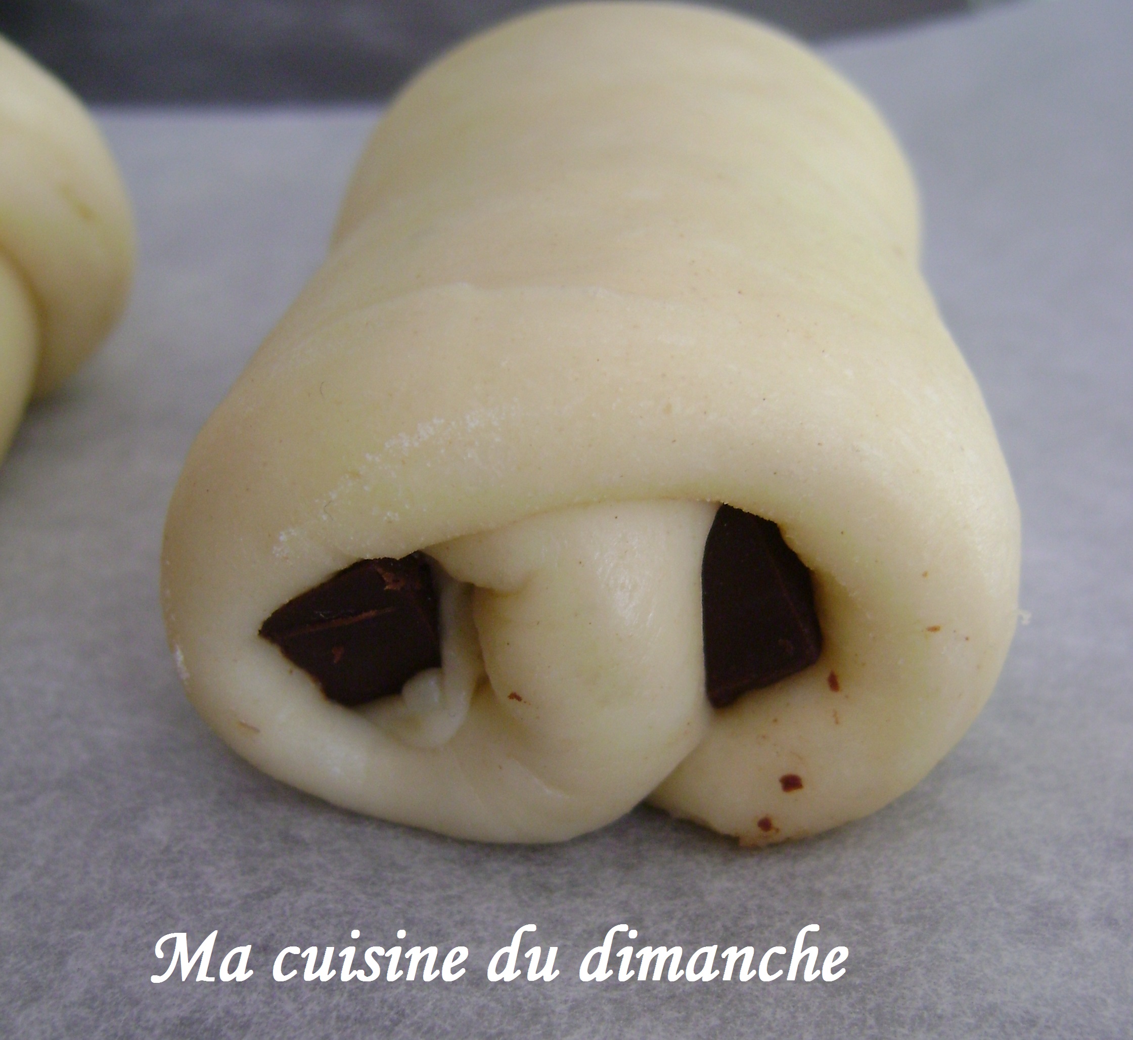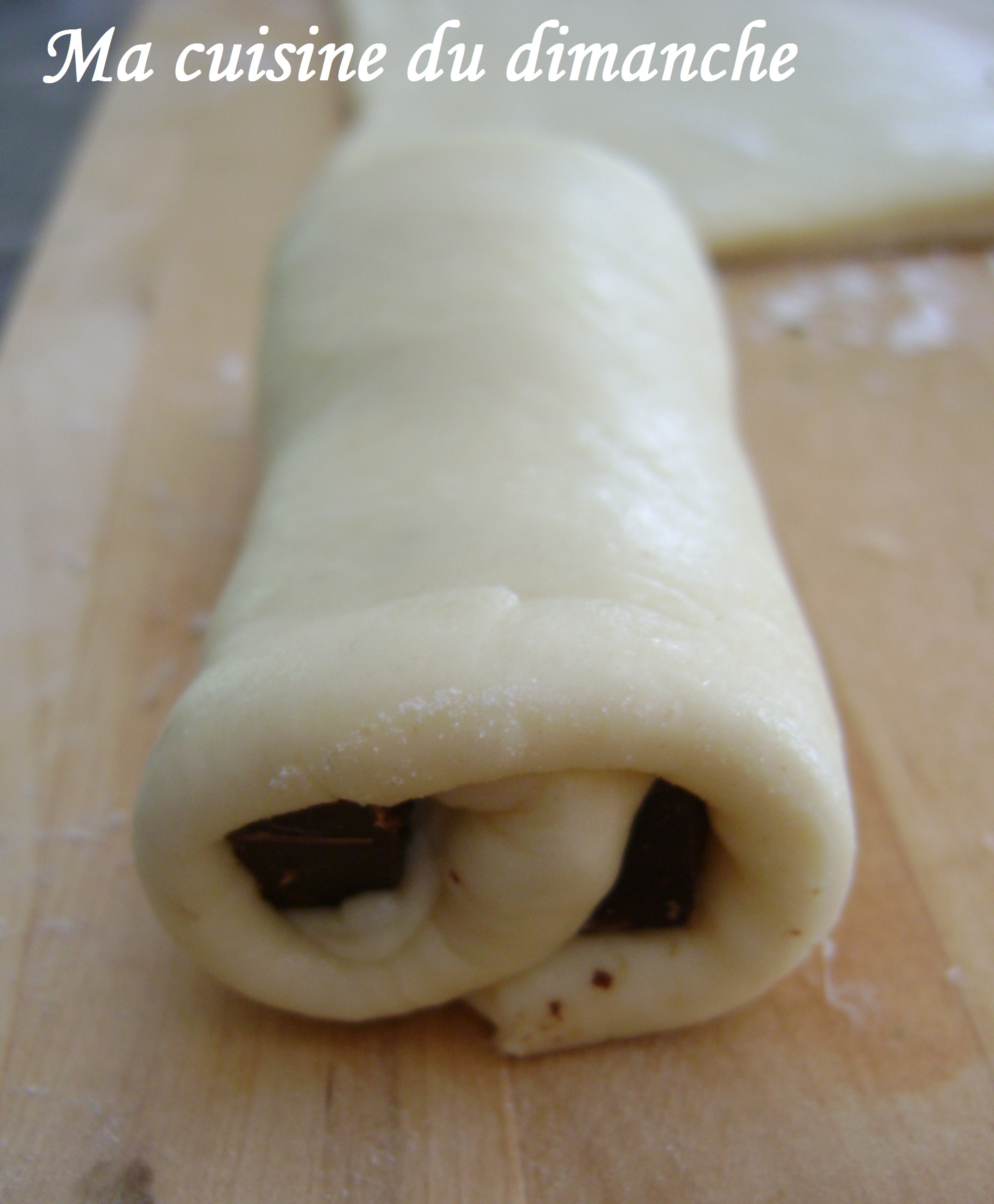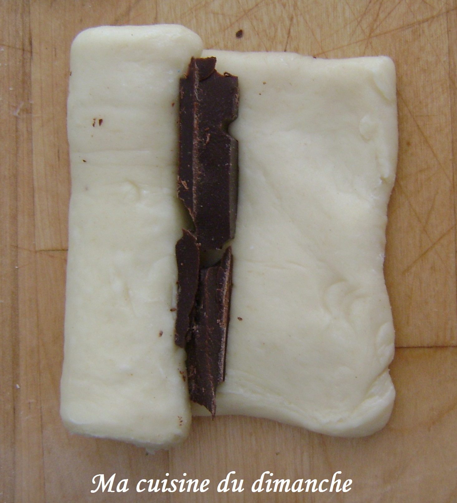 Une fois la première barre de chocolat enveloppée (comme ci-dessous à gauche sous la pâte), il faut déposer une autre barre de chocolat juste à côté de la première (qui est donc recouverte de pâte), et enrouler la pâte en prenant l’extrêmité gauche pour la faire passer sur la nouvelle barre de chocolat.