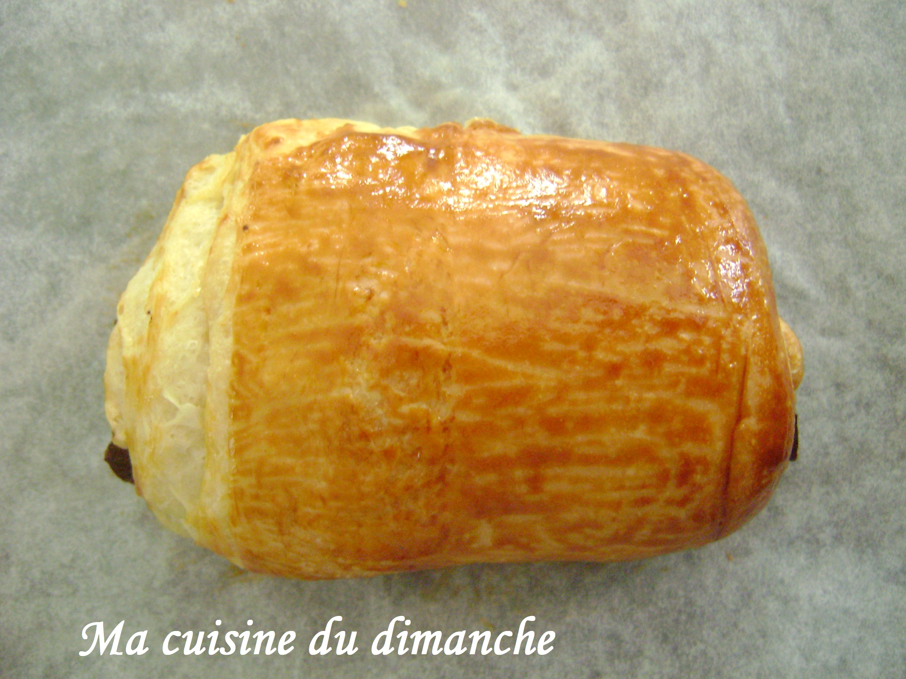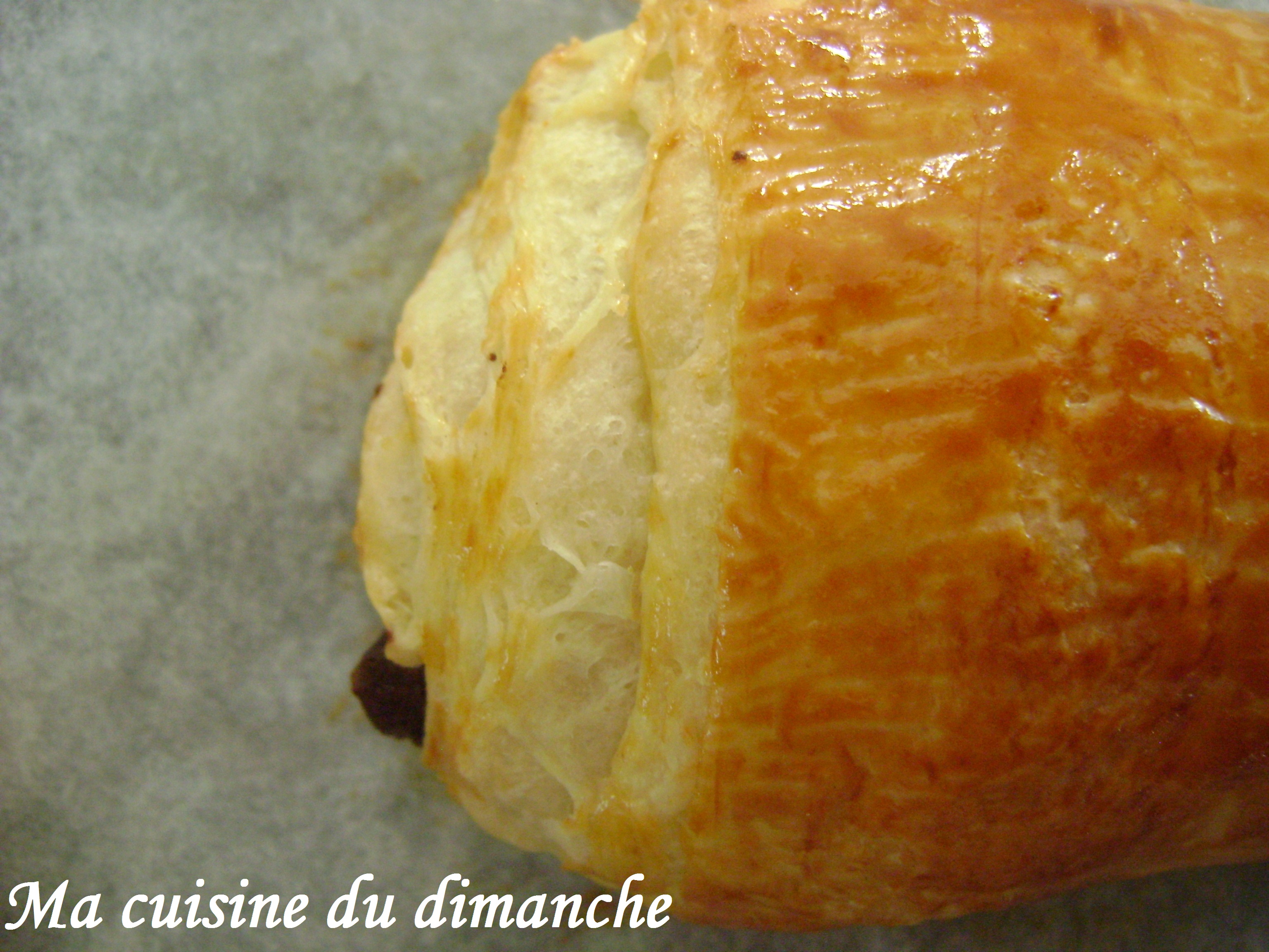 Pour le chocolat, comme je n’avais pas sous la main de barres de chocolat spéciales « pains au chocolat » (que l’on trouve dans les magasins spécialisés), j’ai dû improviser en découpant des bandes de chocolat dans une tablette de chocolat noir. C’est assez sportif (!), en effet c’est pas simple d’obtenir des bandes de chocolat bien droites car le chocolat se casse de manière un peu alléatoire sous la pression de la lame du couteau, mais bon, l’idée est d’arriver à avoir une bande de chocolat qui reste emprisonnée dans la pâte 😉