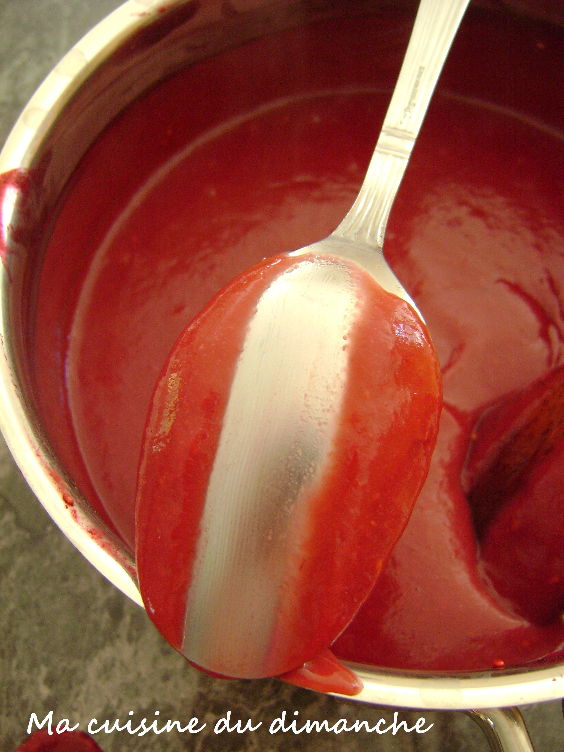 - Faire cuire le tout sur feu doux sans cesser de remuer et stopper la cuisson quand le mélange a la consistance d’une crème pâtissière. Passer votre doigt sur le dos de la cuillère, si la trace est nette, c’est que le mélange est prêt.