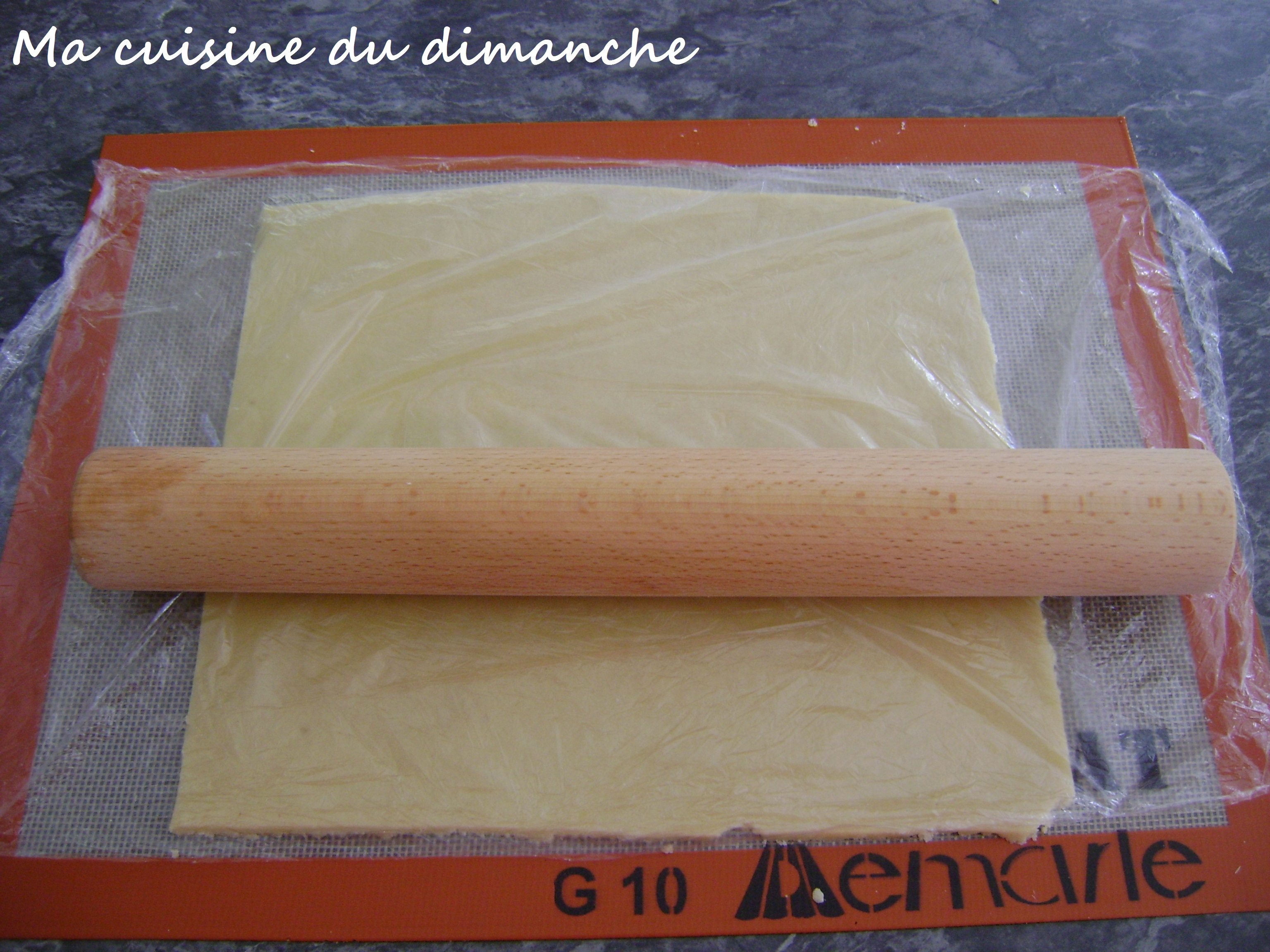 - Etaler la pâte sans trop la travailler (plus on la travaille, plus elle va libérer du gluten et plus elle va être élastique et risque de se rectracter à la cuisson). Personnellement, j’utilise un tapis de cuisson et du film alimentaire pour l’étaler. Je la place sur un tapis de cuisson puis je la recouvre d’un film alimentaire et je l’étale ainsi.