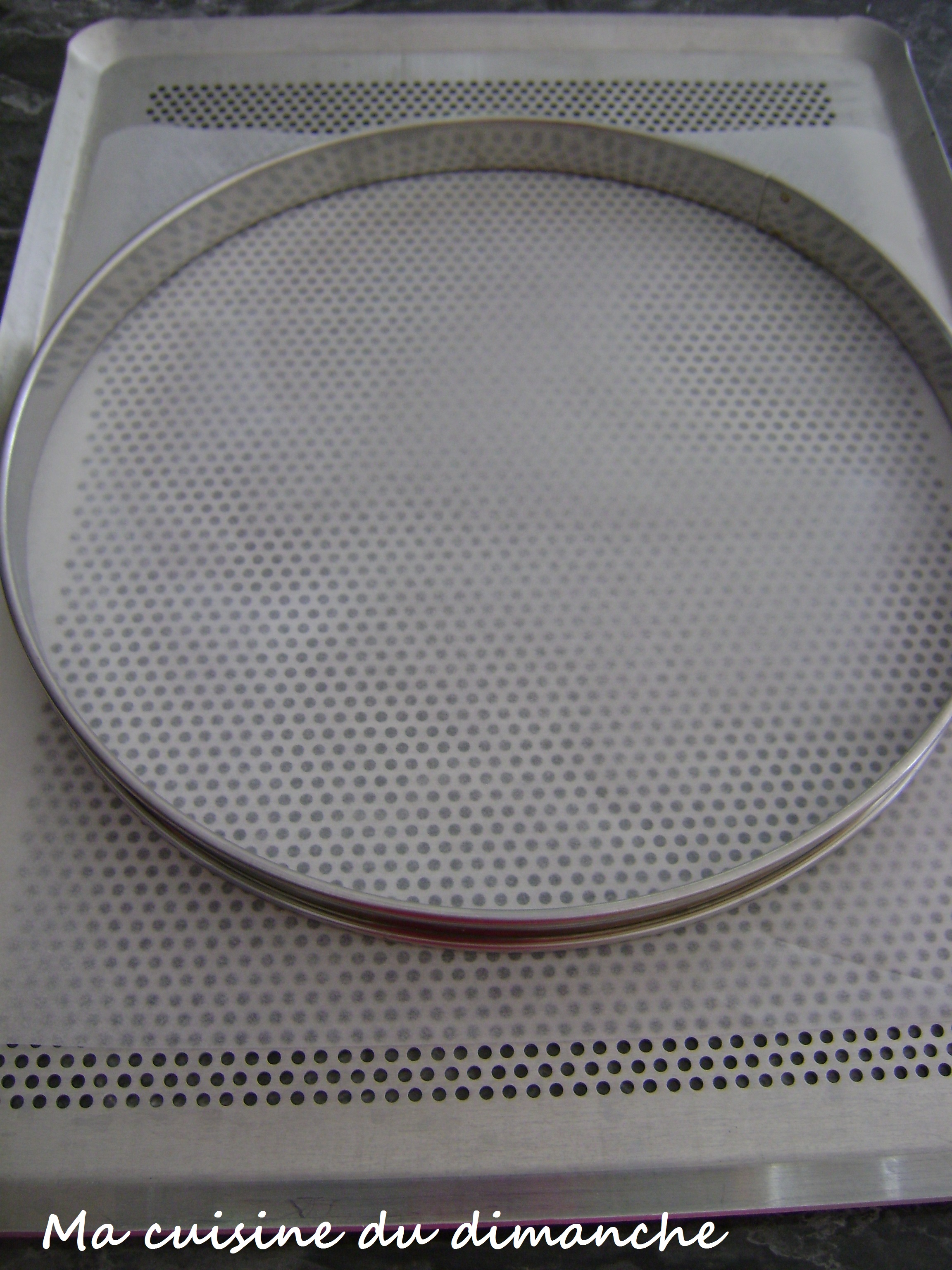 Pour ma part, j’utilise un cercle à tarte car je trouve qu’il présente de nombreux avantages par rapport à un moule classique. Avec un cercle, le démoulage est très simple et rapide. Il permet d’avoir un visuel très esthétique avec de jolis bords, bien droits. De plus, le cercle est posé (sur un papier sulfurisé) directement sur la plaque perforée de cuisson ce qui permet à la pâte d’être toujours en contact avec la chaleur et on obtient un fond de pâte bien cuit.