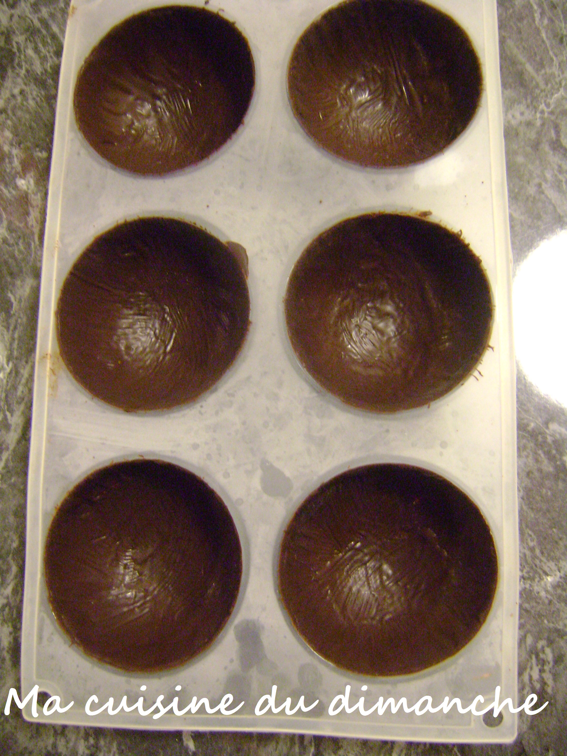 - Placer les moules au frais le temps que le chocolat durcisse (5 minutes devraient suffire car la couche est fine).