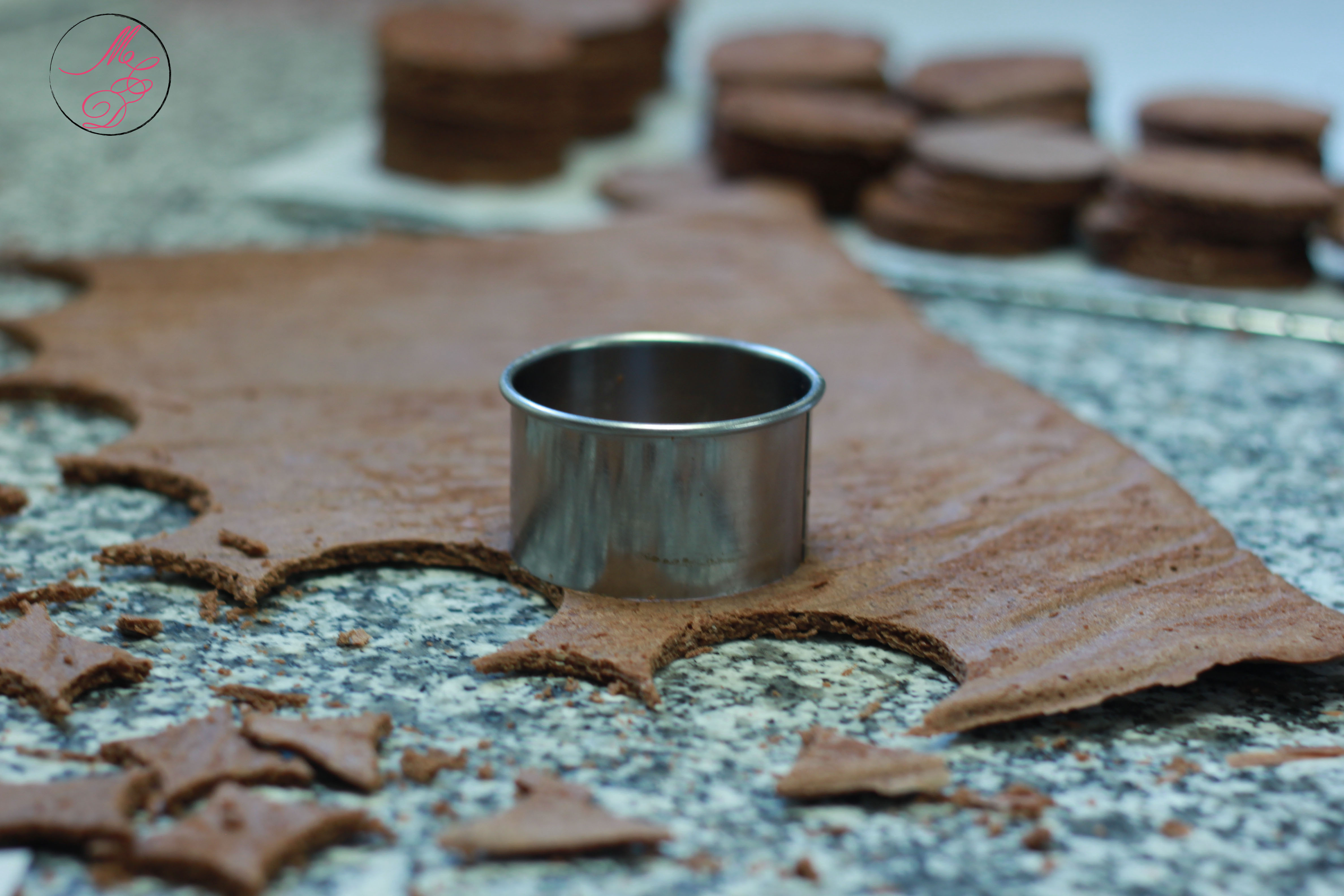 - Quand le biscuit est complétement refroidi, détailler des cercles à l’emporte-pièce (choisir un emporte-pièce du même diamètre que vos moules à dômes).