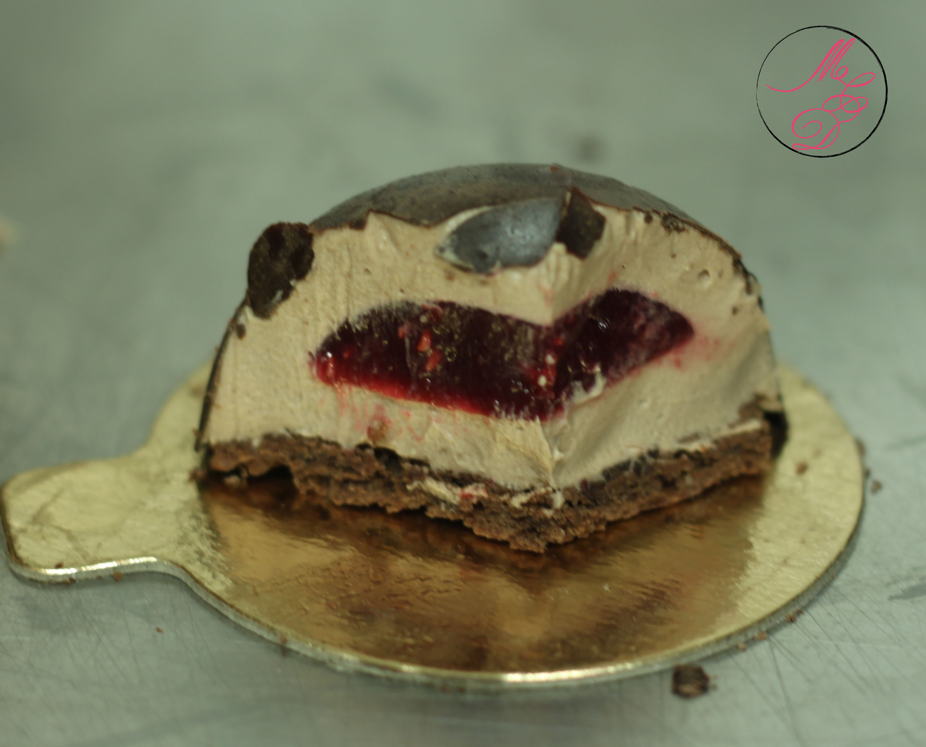 La pâtisserie qui m’a valu ce prix est un dôme en chocolat garni d’une mousse au chocolat et d’un insert à la framboise, le tout reposant sur un biscuit chocolaté.