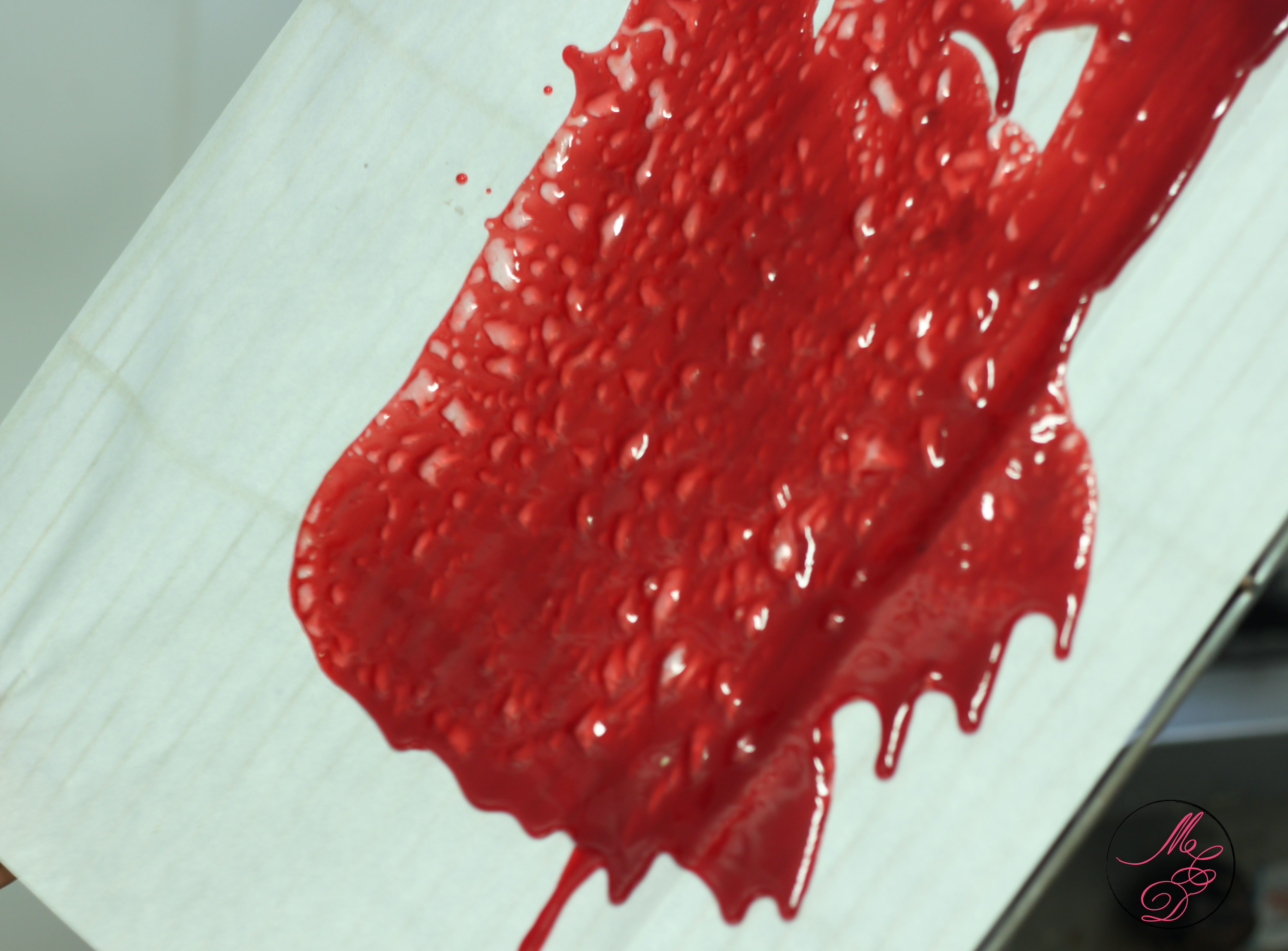 - Verser une bande de caramel rouge sur une plaque de papier spécial sucre et la mettre à la verticale pour faire couler le caramel (des petites bulles vont apparaître à la surface, c’est le sucre bullé).