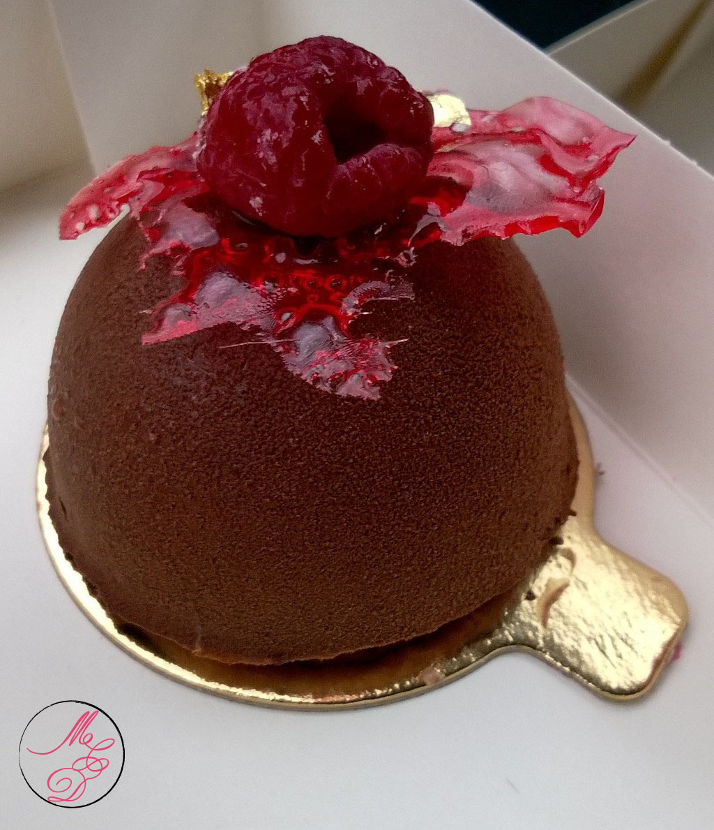 Tel Amélie Poulain, mon petit plaisir avec ces dômes en chocolat, c’est de briser la coque avec la cuillère et d’entendre le petit craquement du chocolat. Puis, tout naturellement, la cuillère va glisser jusqu’au coeur du dôme, où la fraîcheur et l’acidité de la framboise, emmitouflée dans sa mousse légère, viendra titiller les papilles pour leur plus grand bonheur.