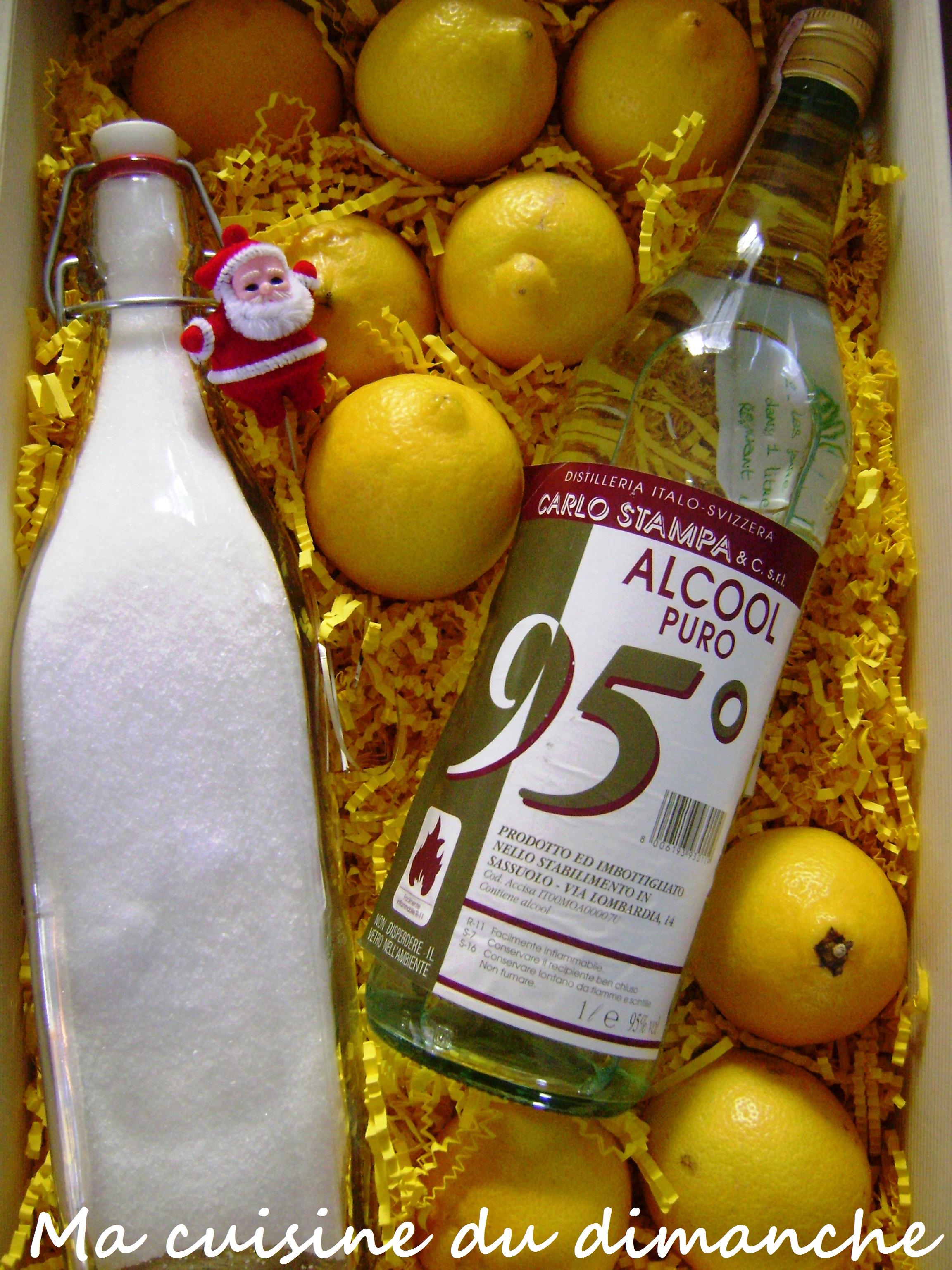 C’est très facile à réaliser, il suffit d’avoir de bons citrons, du sucre, de l’eau et de l’Alcool à 95°, ce dernier sera le plus dur à vous procurer (en France tout du moins car en Italie, l’Alcool se trouve facilement en grandes surfaces). On peut aussi faire macérer les zestes de citron dans de la Grappa (eau-de-vie de marc de raisin produite en Italie). L’écorce du citron, riche en huile essentielle, va lui donner sa magnifique couleur jaune.