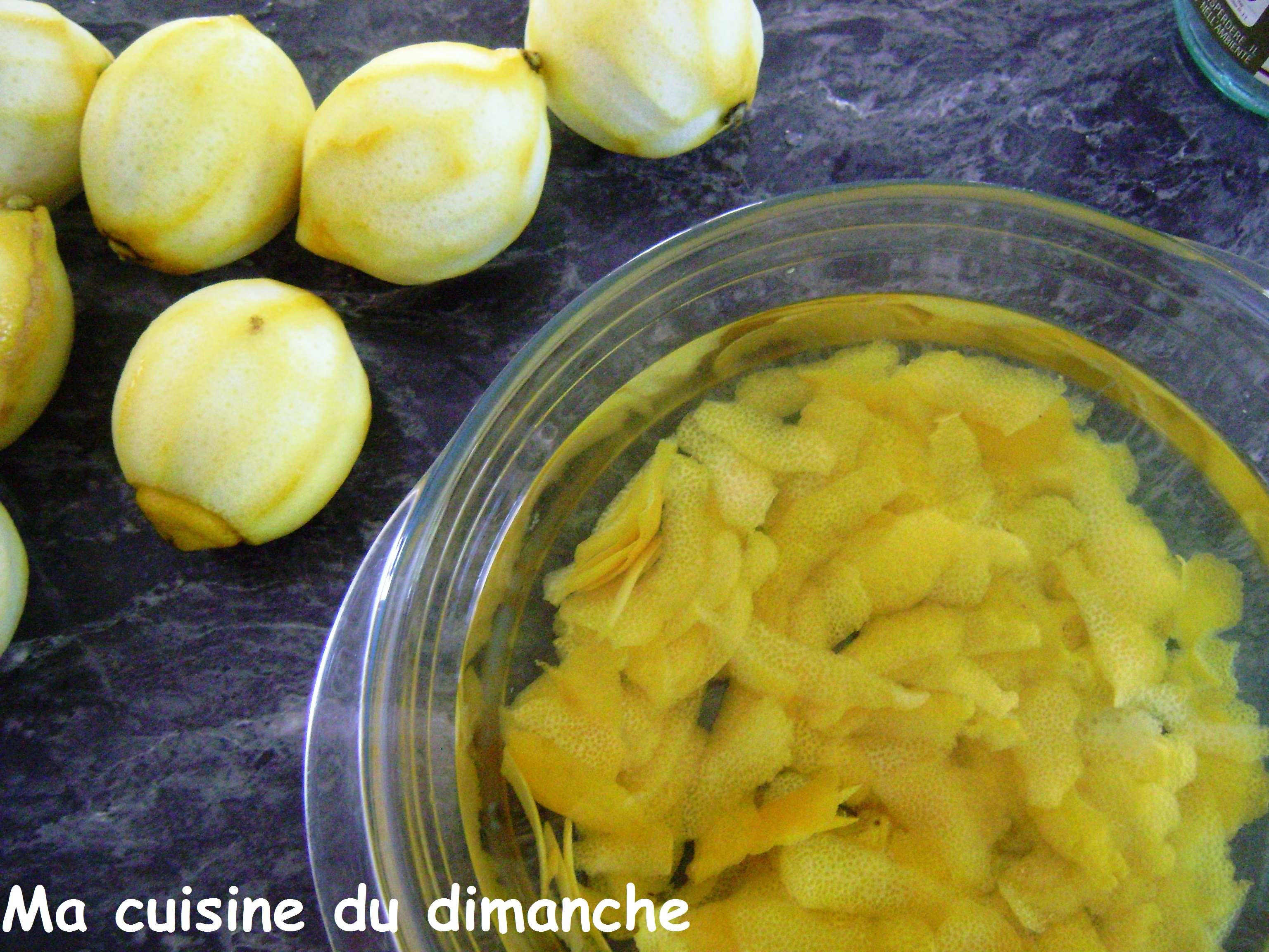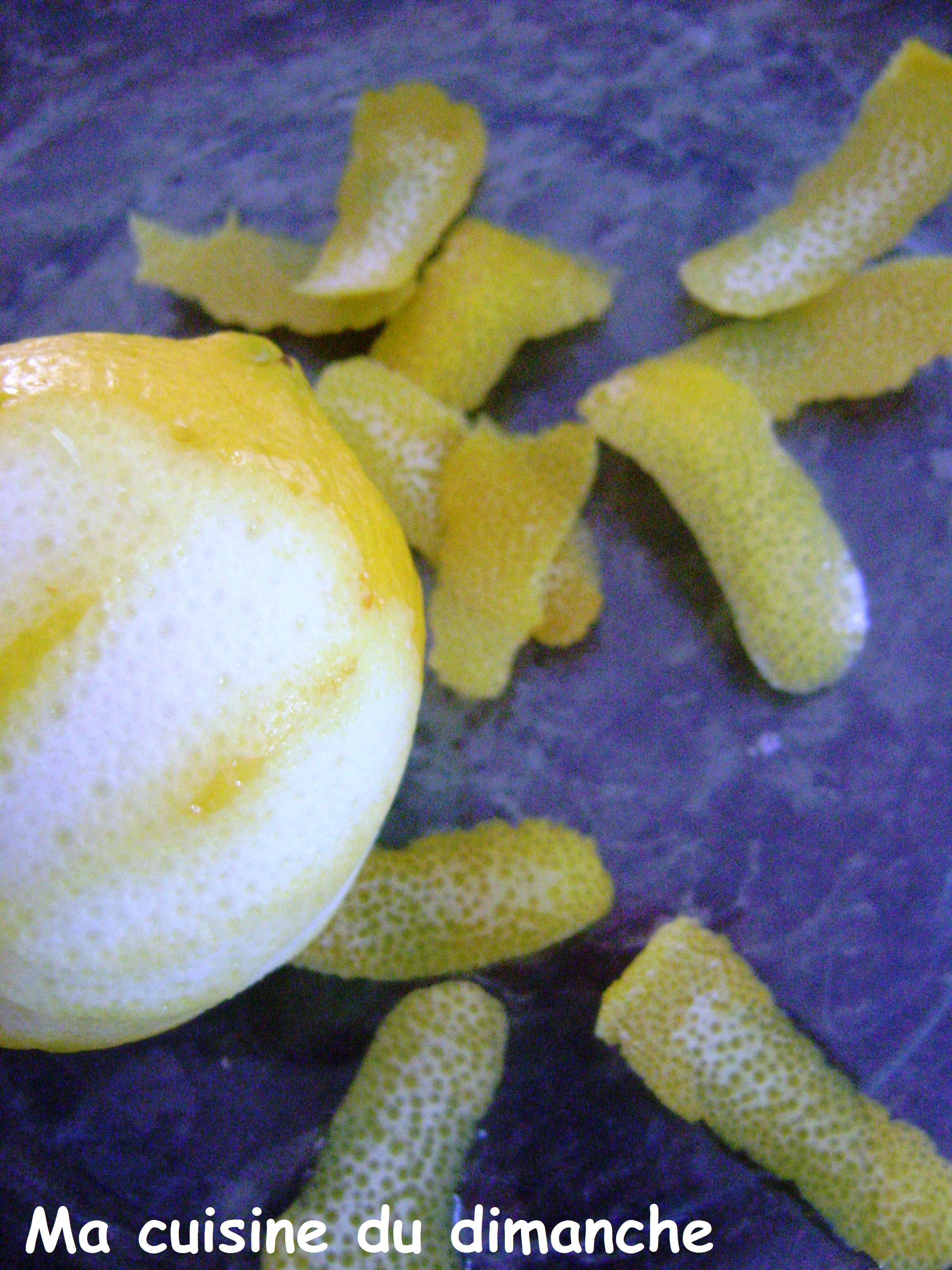• Récupérer les zestes de citrons à l’aide d’un économe (attention à ne prélever que la partie jaune, le blanc étant très amer)