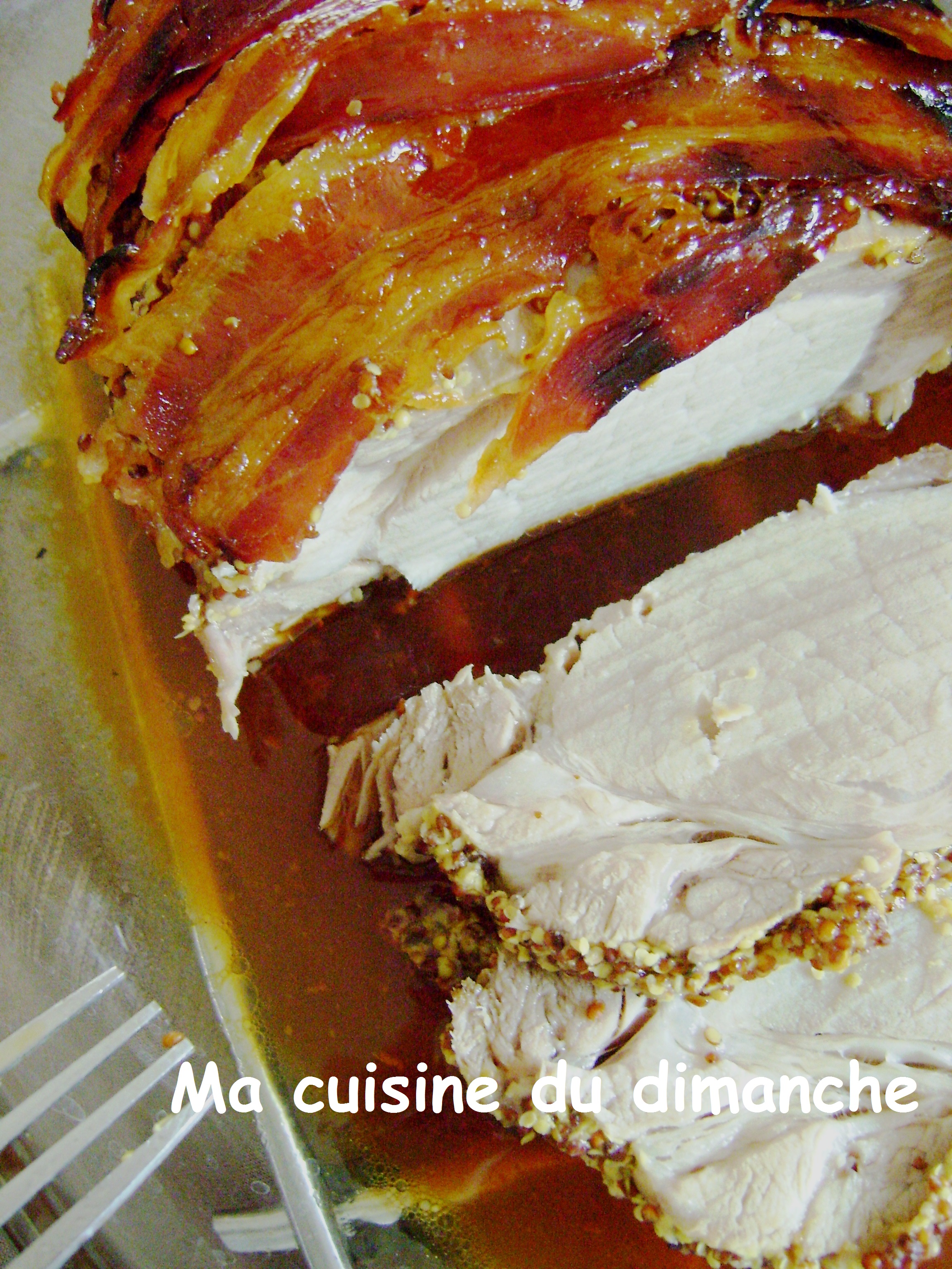 J’adore cette recette de rôti car, en plus d’être ultra rapide, elle peut s’adapter à plusieurs types de viande (porc, poulet, dinde, veau …). Le petit mélange sucré-salé est fort agréable. La douceur du miel vient contrebalancer la force et le côté acide de la moutarde. On obtient alors un agréable contraste, un juste équilibre. Le lard quant à lui va apporter un peu de gras pour « nourrir » la viande et lui éviter d’être sèche.