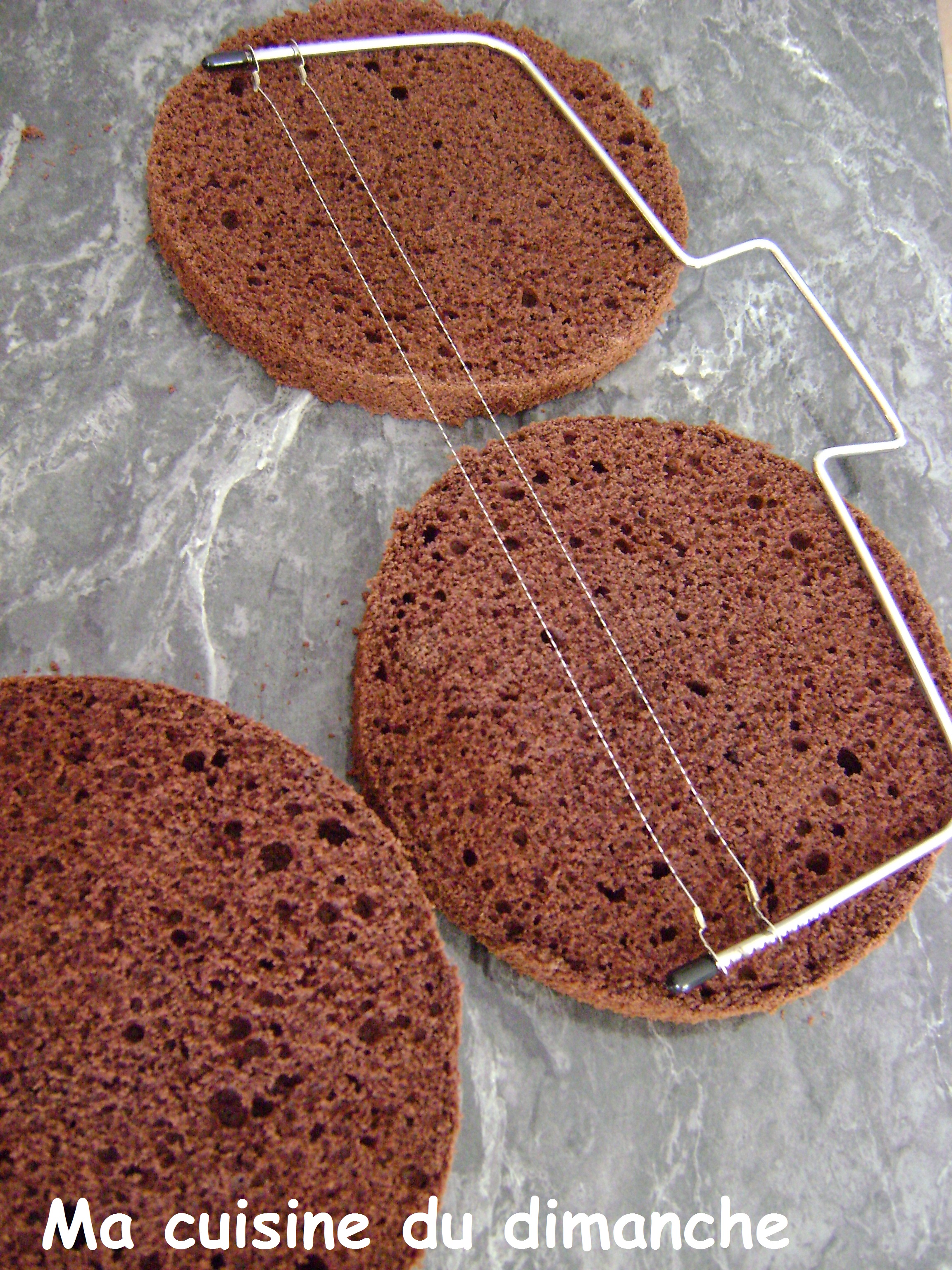 - Quand le gâteau est bien refroidi, le couper en 3. Pour cela j’ai utilisé un découpe gâteau, c’est très pratique pour diviser uniformement les gâteaux en plusieurs parties et c’est vraiment l’idéal pour le fourrage de garniture sur plusieurs étages. Le découpe gâteau est doté de fils rigides qui permettent de couper avec précision.
