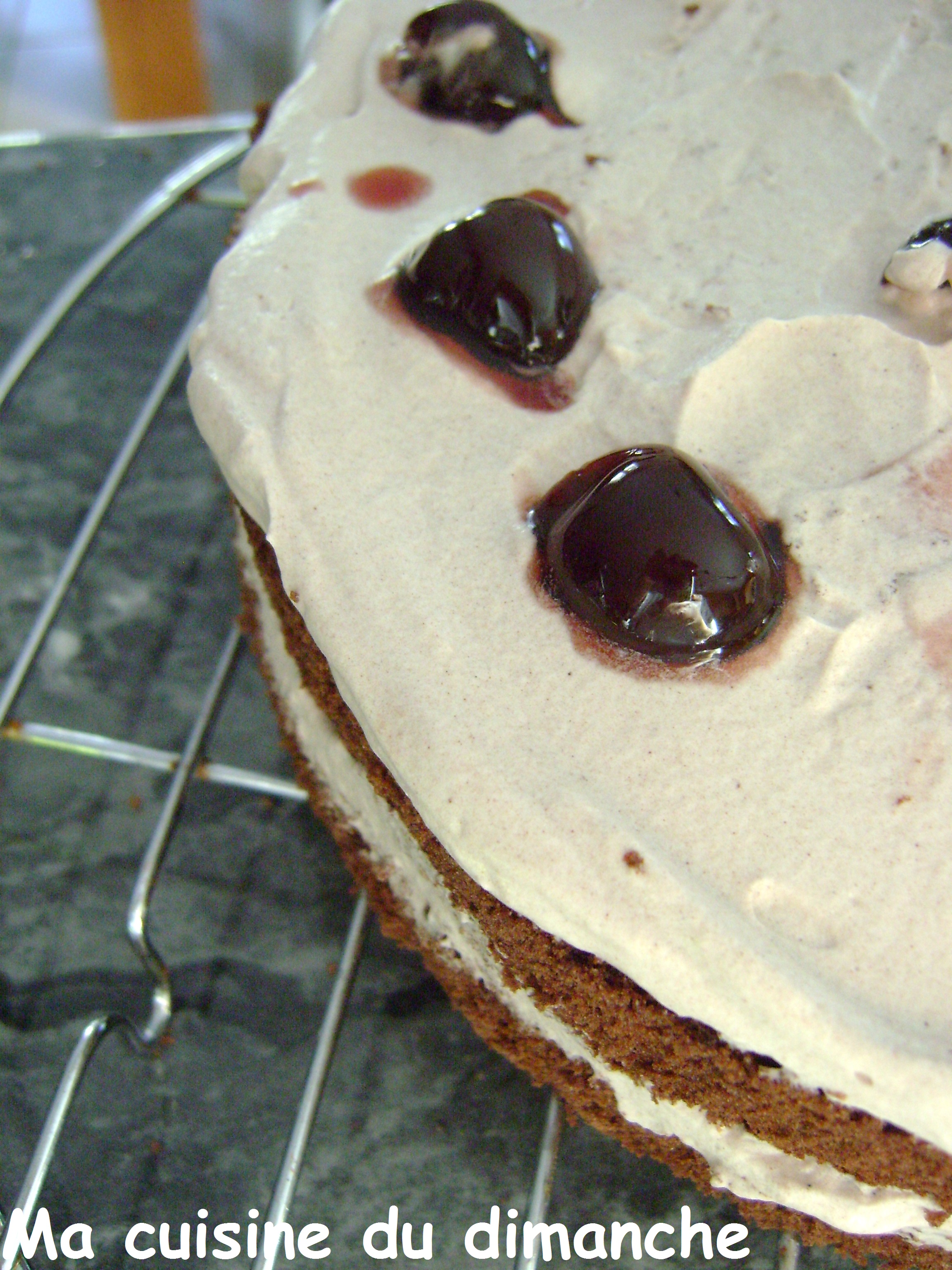 Ce gâteau ressemble beaucoup à une forêt noire dans sa manière d’être conçu mais le goût de la cerise Amarena, très sucrée et confite, lui donne une autre dimension.