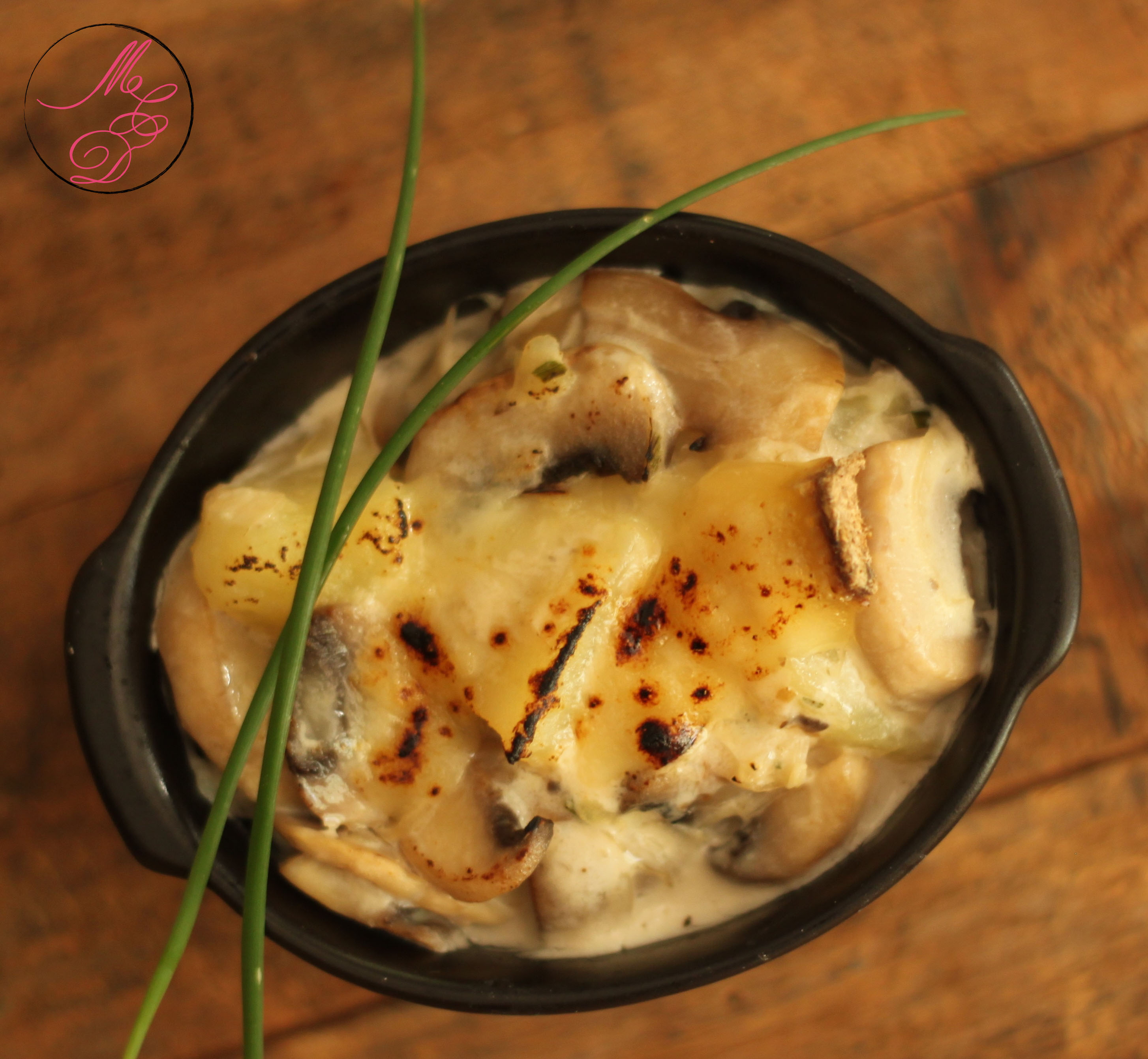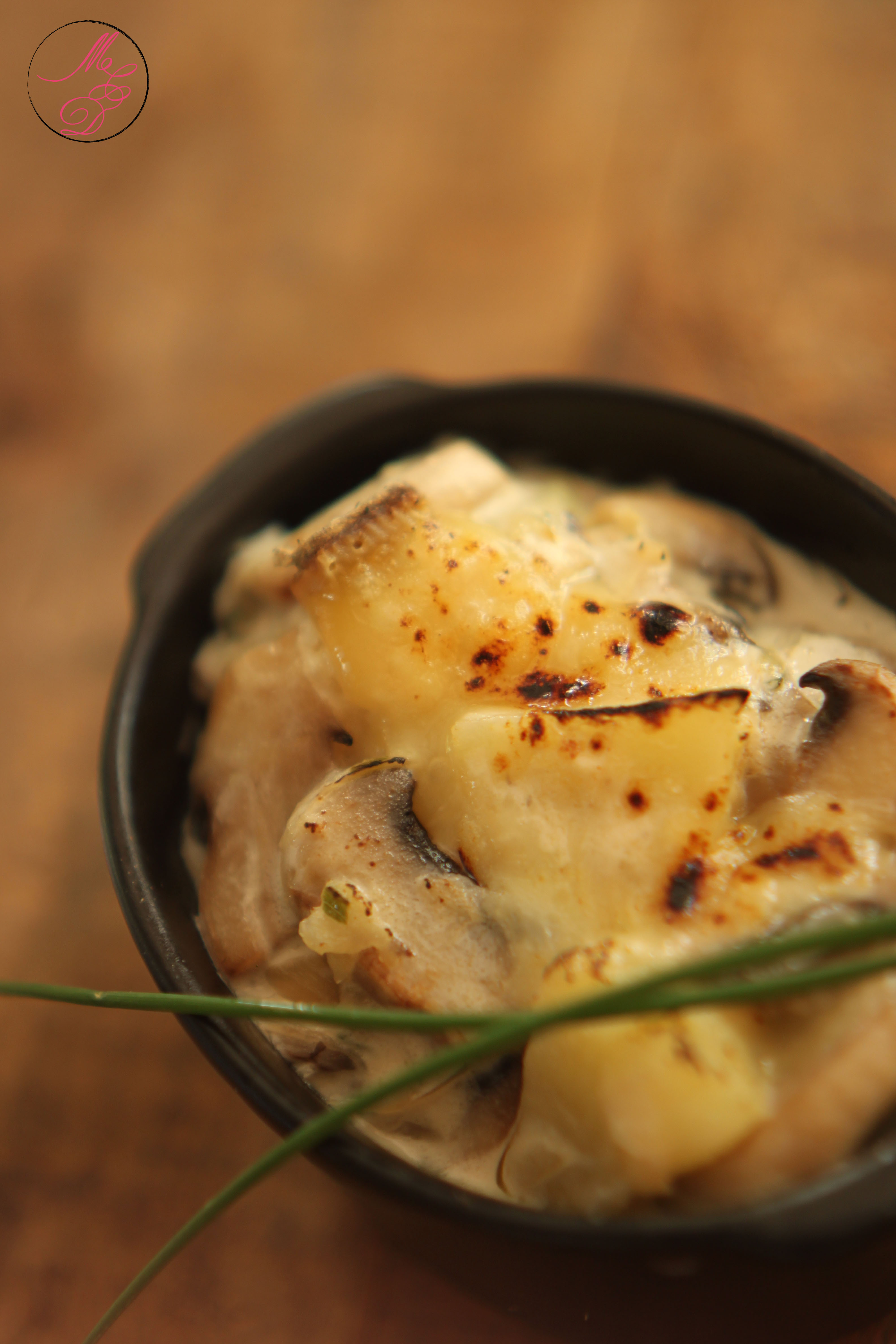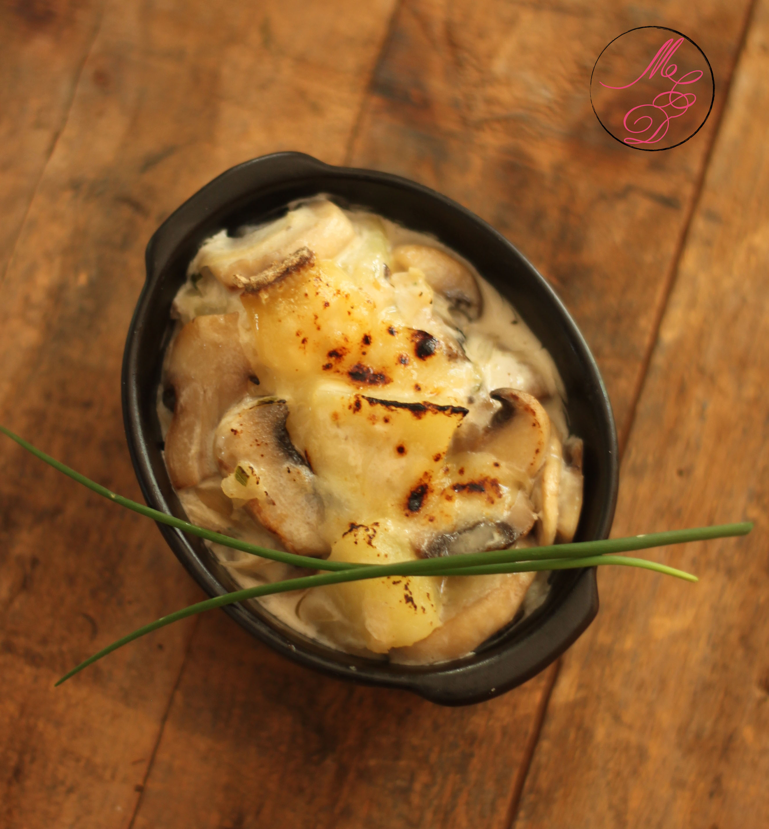 Ce gratin aux allures pourtant automnales a accompagné dignement notre dernier barbecue printanier. Au départ, j’avais prévu de farcir individuellement des pommes de terre avec une base de champignons, échalottes et Tomme de Savoie, puis finalement, la flemme aidant, j’ai décidé de mélanger le tout et d’en faire un gratin. Une fois la base du gratin faite, il vous suffit de répartir la préparation dans des petites cocottes (histoire d’en mettre plein la vue avec un minimum d’effort 🙂 )