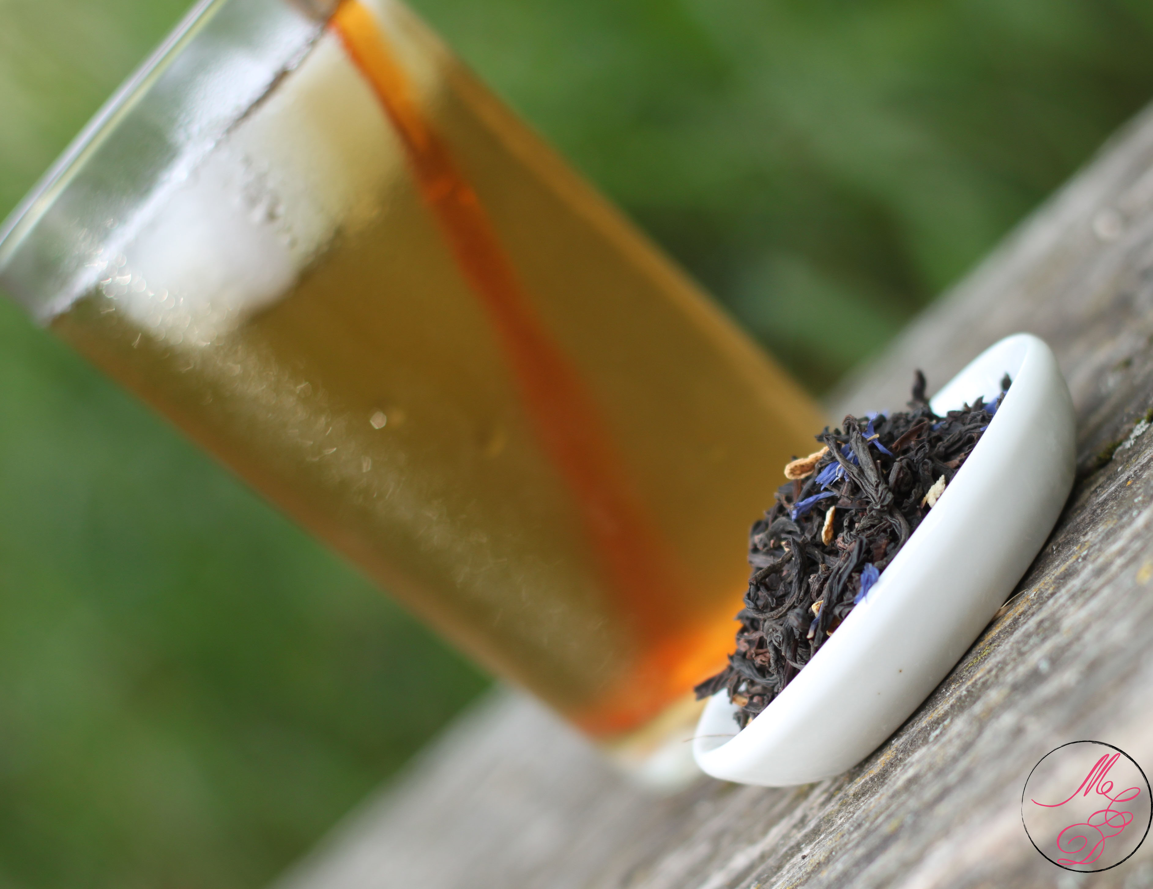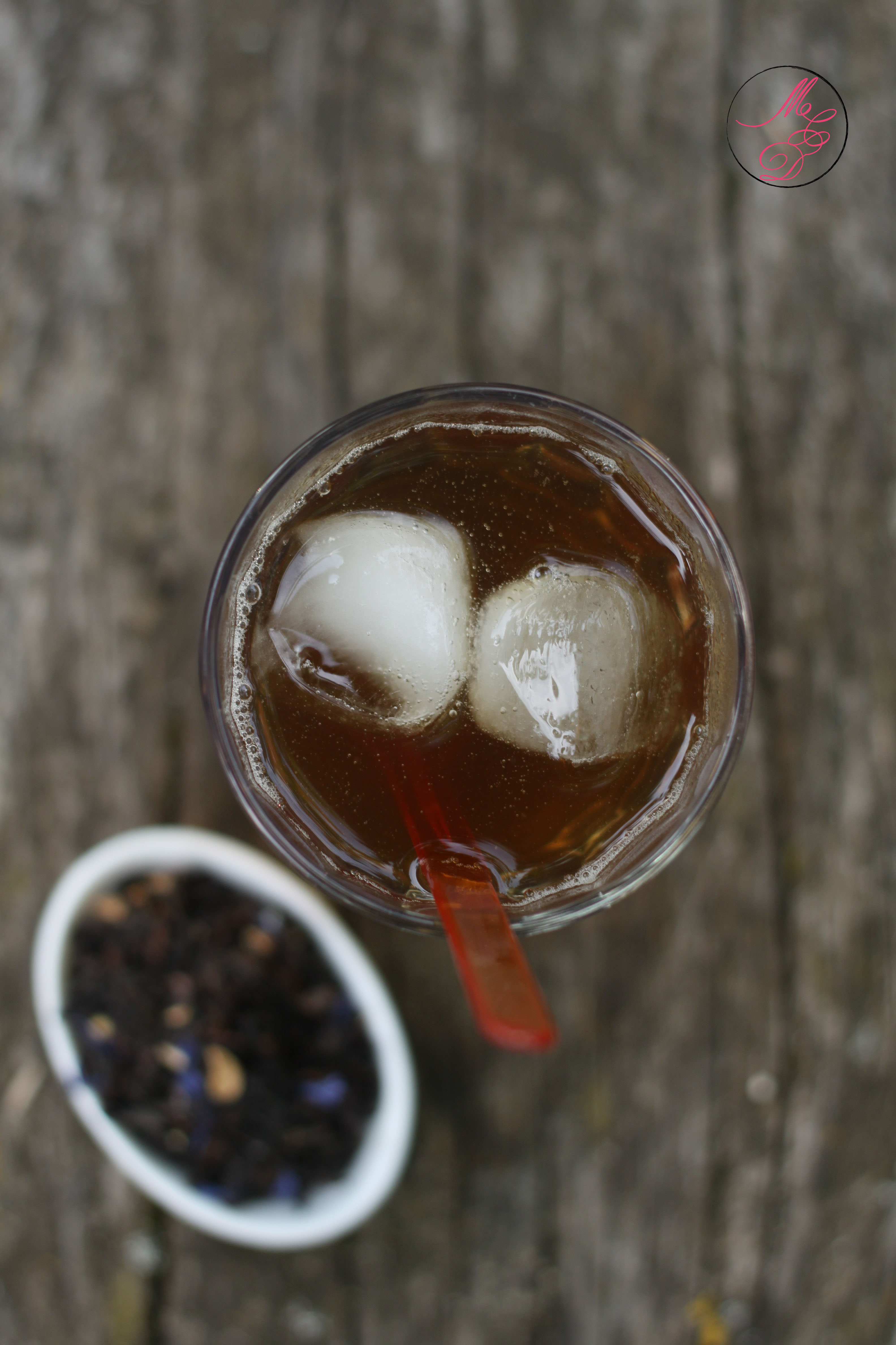 Ici j’ai fait infuser du thé russe Earl Grey, c’est un thé noir aromatisé à la bergamote, aux fleurs séchées de bleuet et aux agrumes (zestes d’orange et de citron). C’est très parfumé et en version glacée, c’est vraiment très bon.