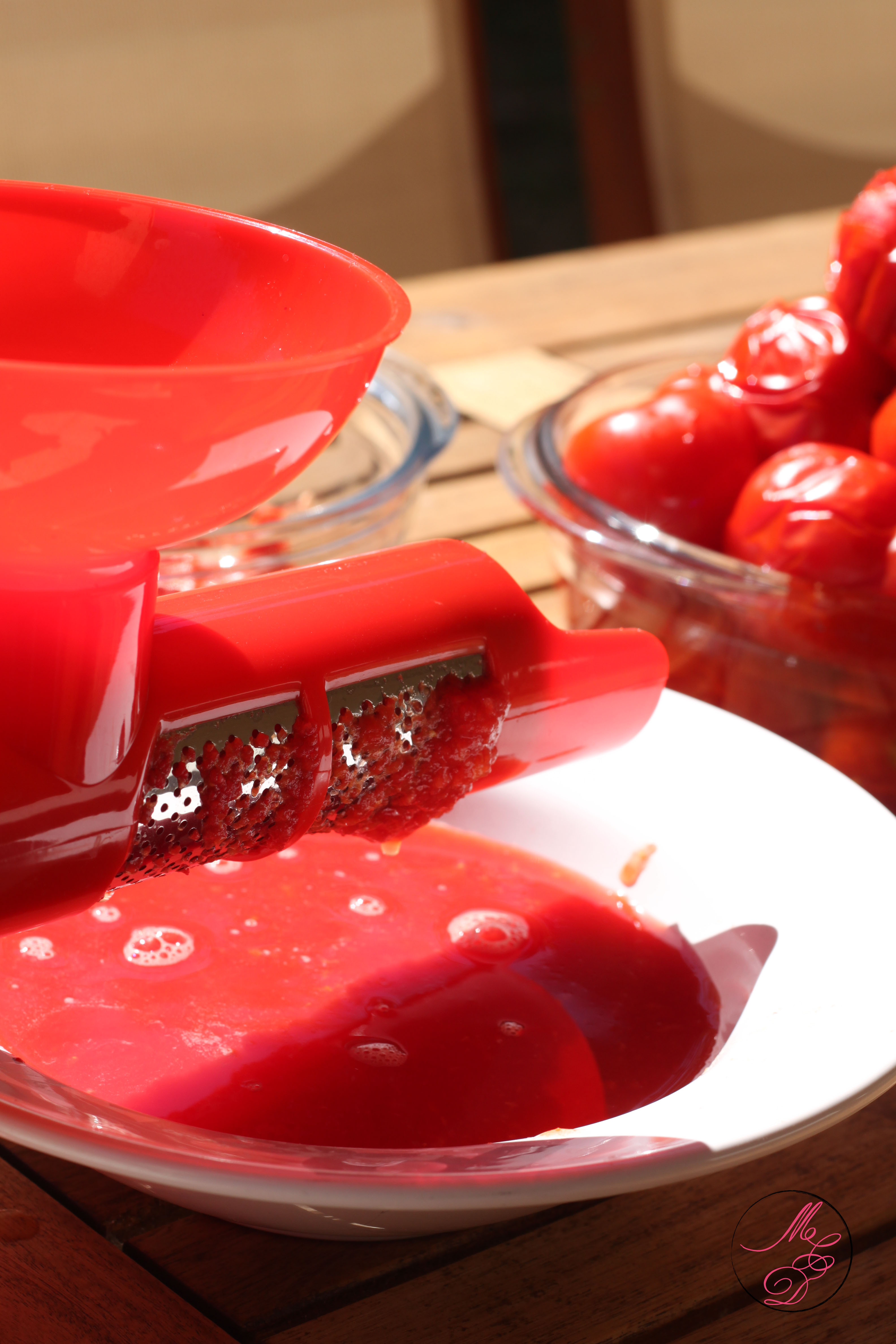 - Si vous n’avez pas l’appareil pour presser les tomates, vous pouvez utiliser un moulin à légumes. Dans ce cas, avant de presser les tomates, enlevez la peau (ça sera très simple car une fois que les tomates auront été ébouillantées leur peau s’enlèvera très facilement). Une fois la peau enlevée, il faudra presser chaque tomate pour faire sortir les pépins. Ensuite, passez les tomates au moulin à légumes.