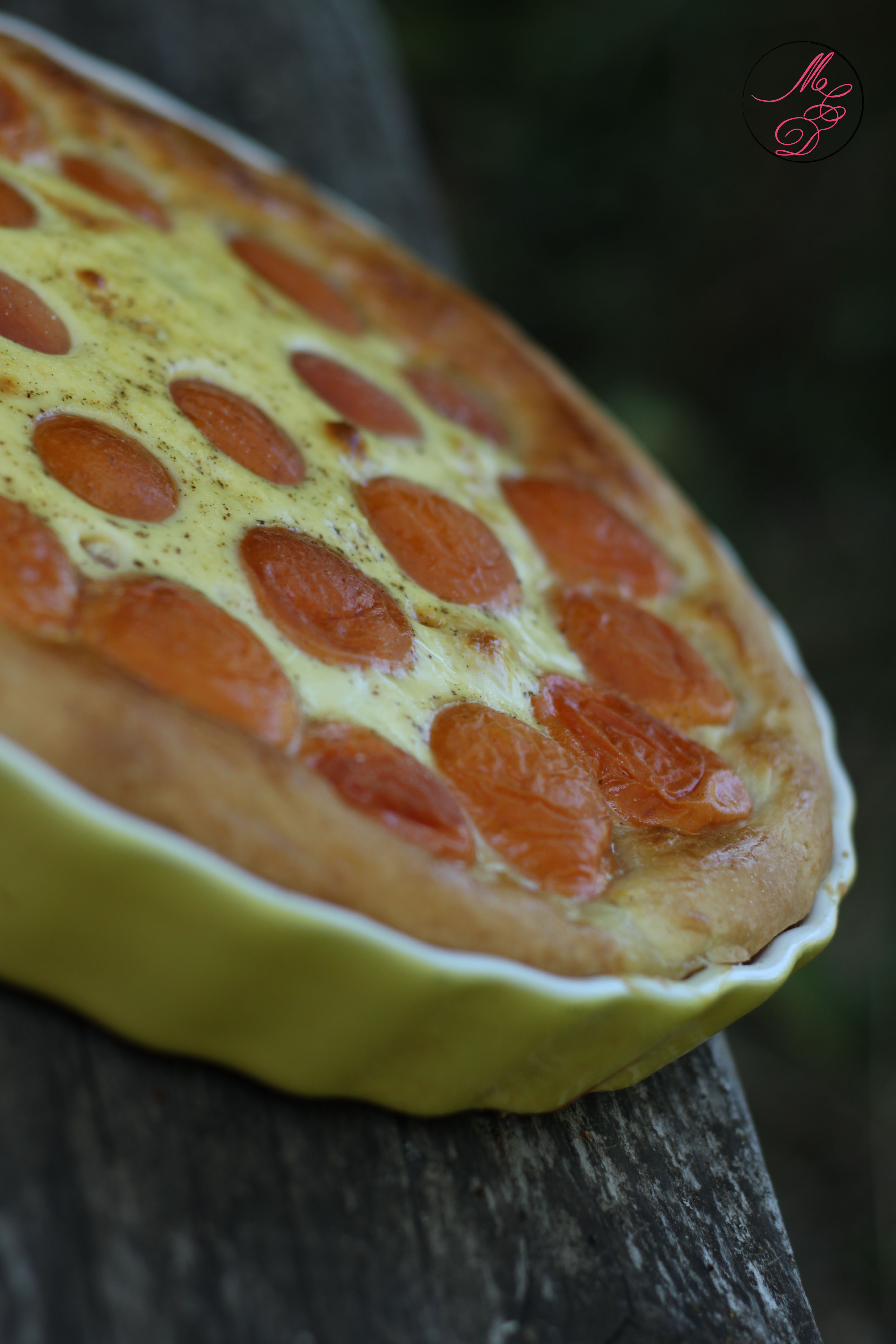 Pour ce qui est de la garniture, j’ai fait dans la simplicité. Une migaine réalisée uniquement avec des œufs et de la crème afin d’adoucir la légère acidité des abricots. J’ai saupoudré un peu de sucre vanillé avant d’enfourner et hop le tour est joué !
