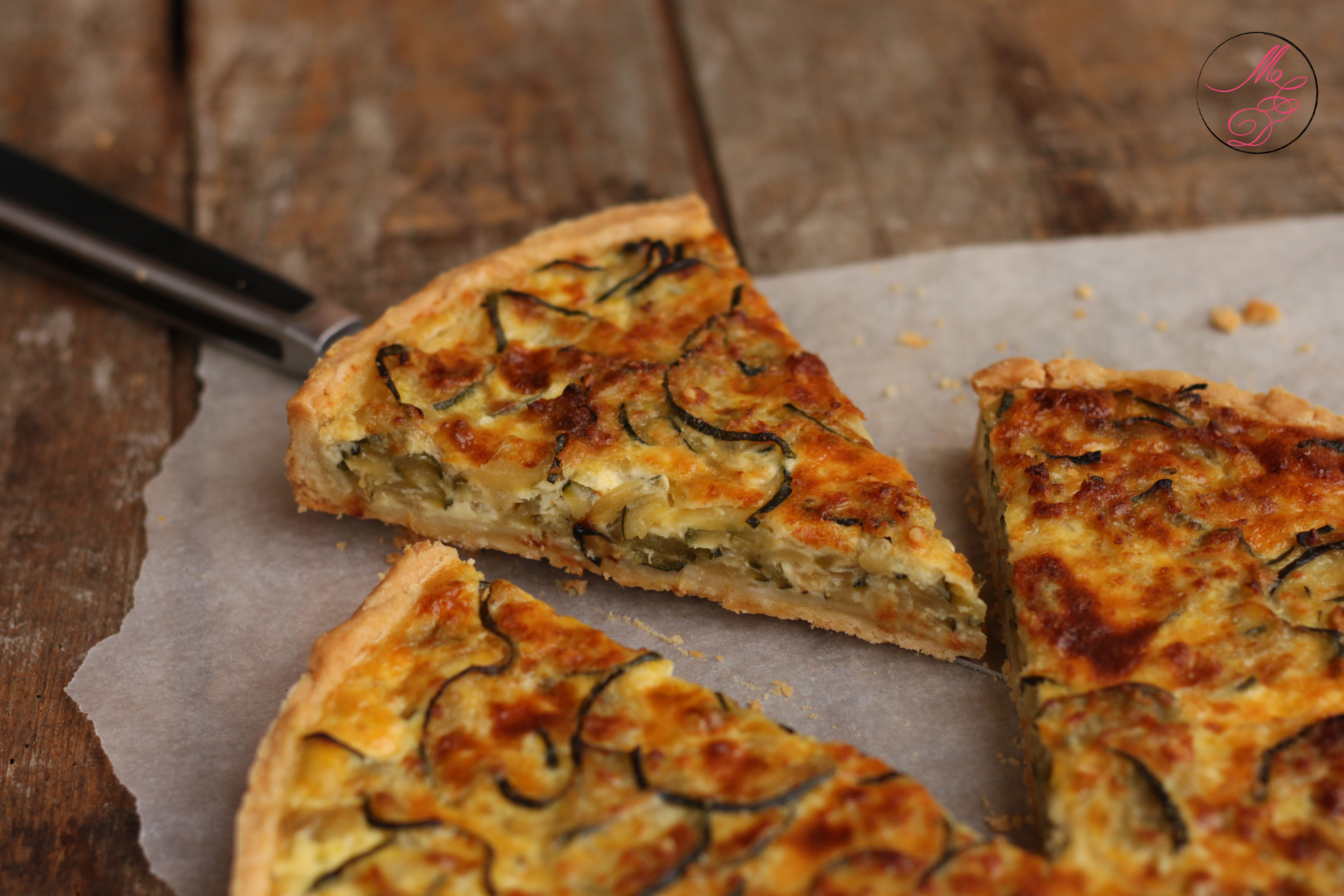 Aujourd’hui, je l’ai garnie avec une belle courgette du jardin, douce et sucrée, et des oignons jaunes. Au préalable, j’ai fait revenir l’ensemble à la poêle avec un peu d’huile d’olive, afin que la courgette rende un maximum d’eau (rien de plus désagréable qu’une quiche humide car les légumes ont rendu de l’eau !). Les légumes sont ainsi déjà un peu cuisinés quand ils viennent garnir le fond de pâte, ce qui rendra votre quiche encore plus savoureuse !