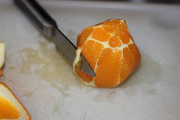 - Peler l’orange à vif (c’est à dire retirer la peau et la partie blanchâtre pour ne conserver que la pulpe, bref le meilleur…). Pour cela, il faut s’équiper d’un petit couteau d’office bien aiguisé. Couper les deux extrémités de l’orange de façon à ce qu’elle soit bien stable sur votre plan de travail. Découper la peau du fruit, en suivant la courbe de l’orange (image 1 et 2). Il faut enlever un maximum de peau blanche (image 3), sans gaspiller la pulpe du fruit ! Ensuite, on passe la lame du couteau entre chaque quartier d’orange en longeant la petite peau fine qui sépare les quartiers (image 4), et on extrait délicatement les quartiers de pulpe (image 5)