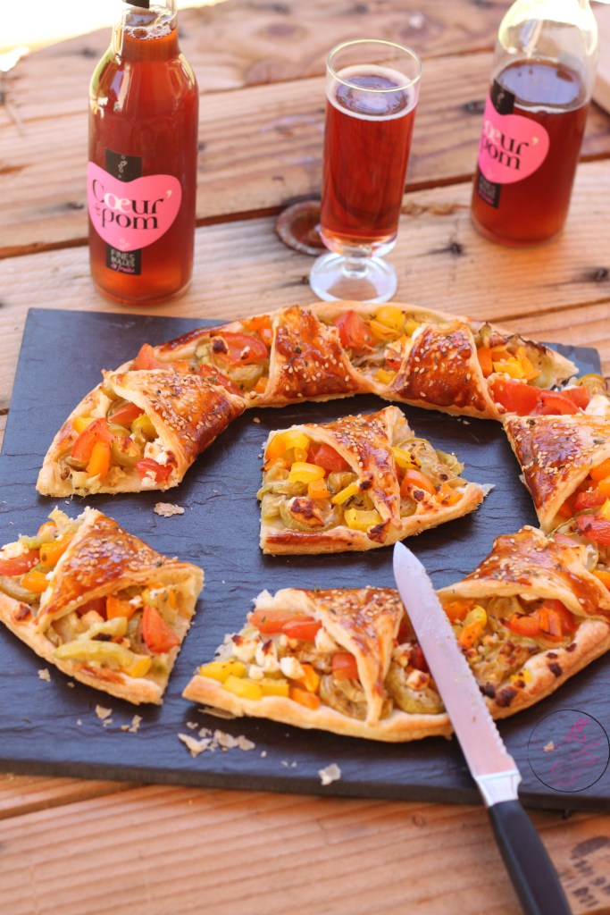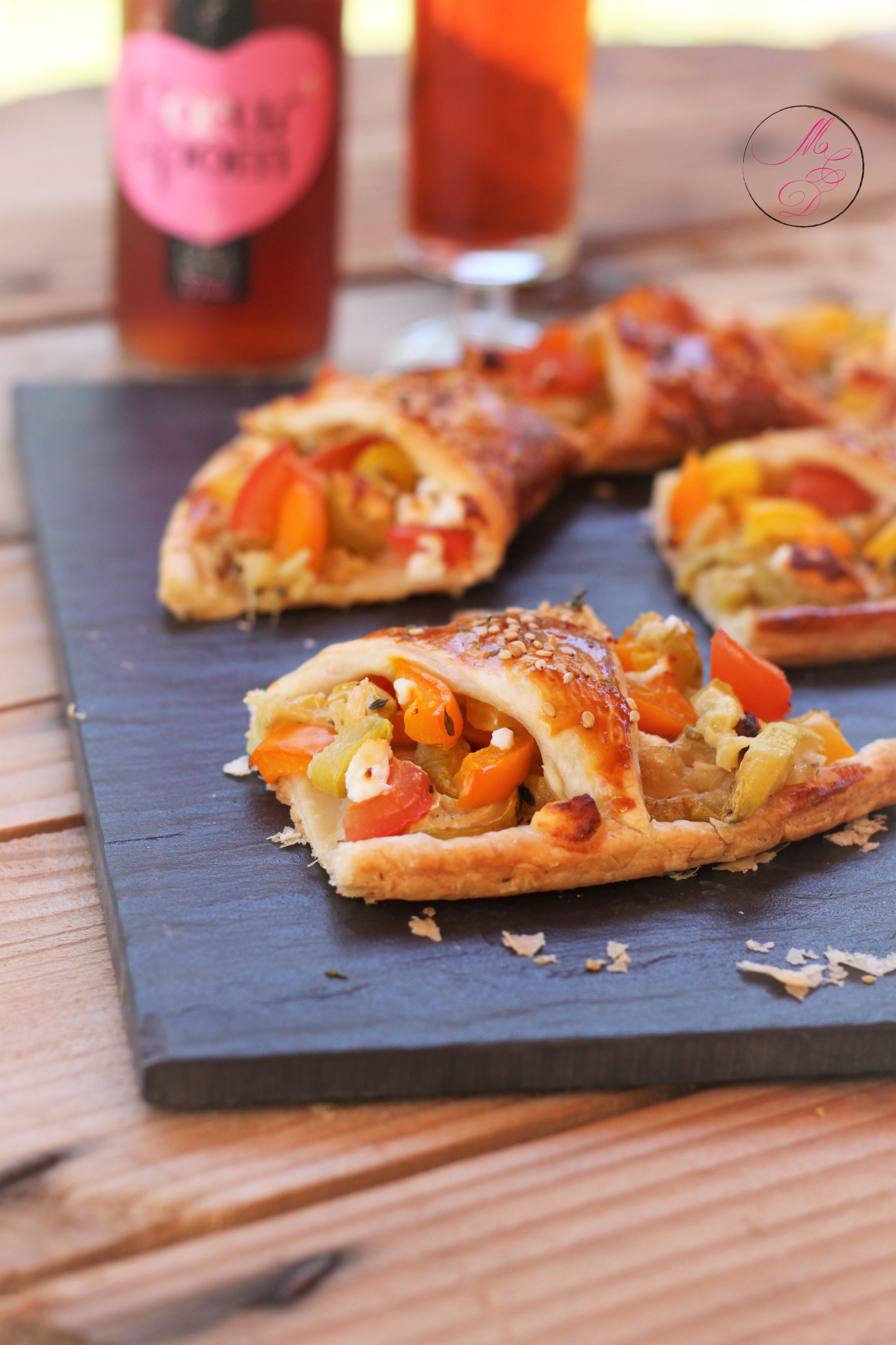 Imaginez de bons légumes du soleil : poivrons, courgettes, tomates … qui viennent gentiment agrémenter une pâte feuilletée, le tout recouvert de morceaux de feta, rien que l’odeur qui se dégage en cuisine est déjà un pur moment de bonheur !
