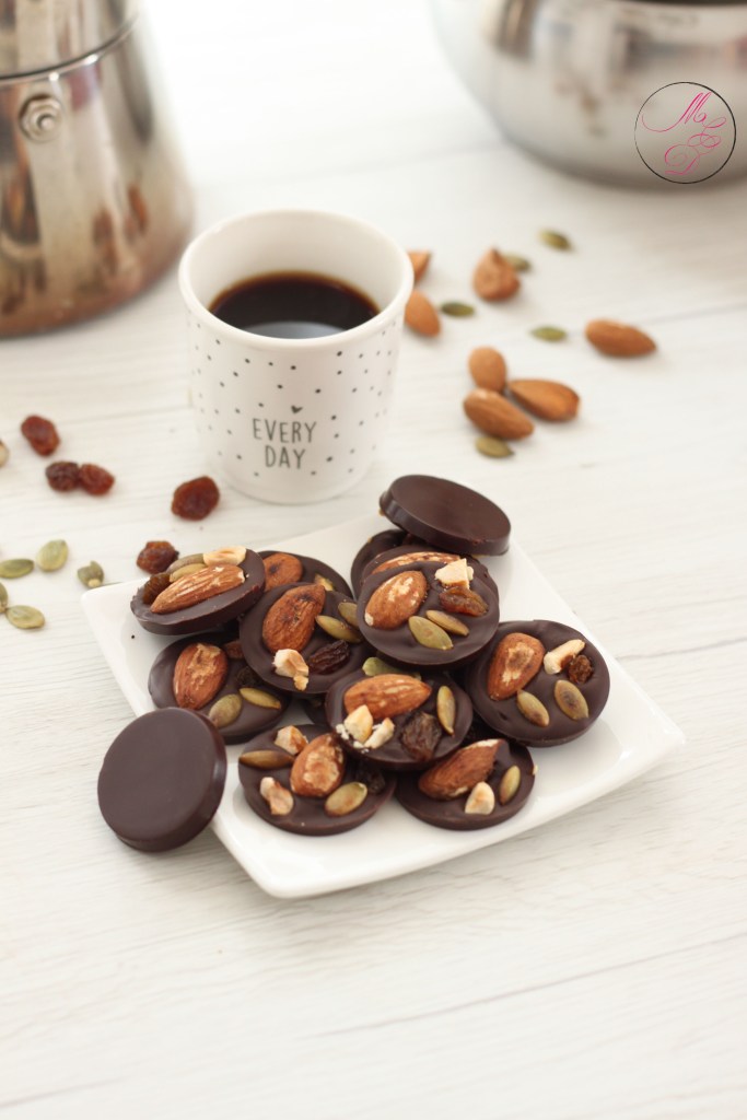 Me revoilà avec une jolie gourmandise à partager, de délicieux palets au chocolat, plus connus sous le nom de Mendiants. Pourquoi ce nom ? après avoir fait quelques recherches, il semblerait que les Mendiants tirent leur nom des ordres religieux (les « Ordres mendiants ») datant du XIIe siècle. Ils ont été nommés ainsi car c’est exclusivement à la charité et à la générosité des peuples qu’ils devaient leur survie. En mendiant et en recevant le soutien financier de leurs donateurs, ils pouvaient œuvrer pleinement à la dévotion religieuse et respecter ainsi leur vœu de pauvreté. Voilà c’était la minute culture. Maintenant, parlons un peu de ces merveilles. Il s’agit de petits palets de chocolat qui sont recouverts de toutes sortes de fruits secs, fruits confits, de graines etc. Pour le choix du chocolat, on peut opter pour n’importe quel type de chocolat (noir, lait, blanc) en privilégiant si possible un bon cru (chocolat de couverture, par exemple) afin d’obtenir le meilleur résultat possible. Après, toutes les audaces et fantaisies sont possibles et vous pouvez vous amuser en variant la garniture.