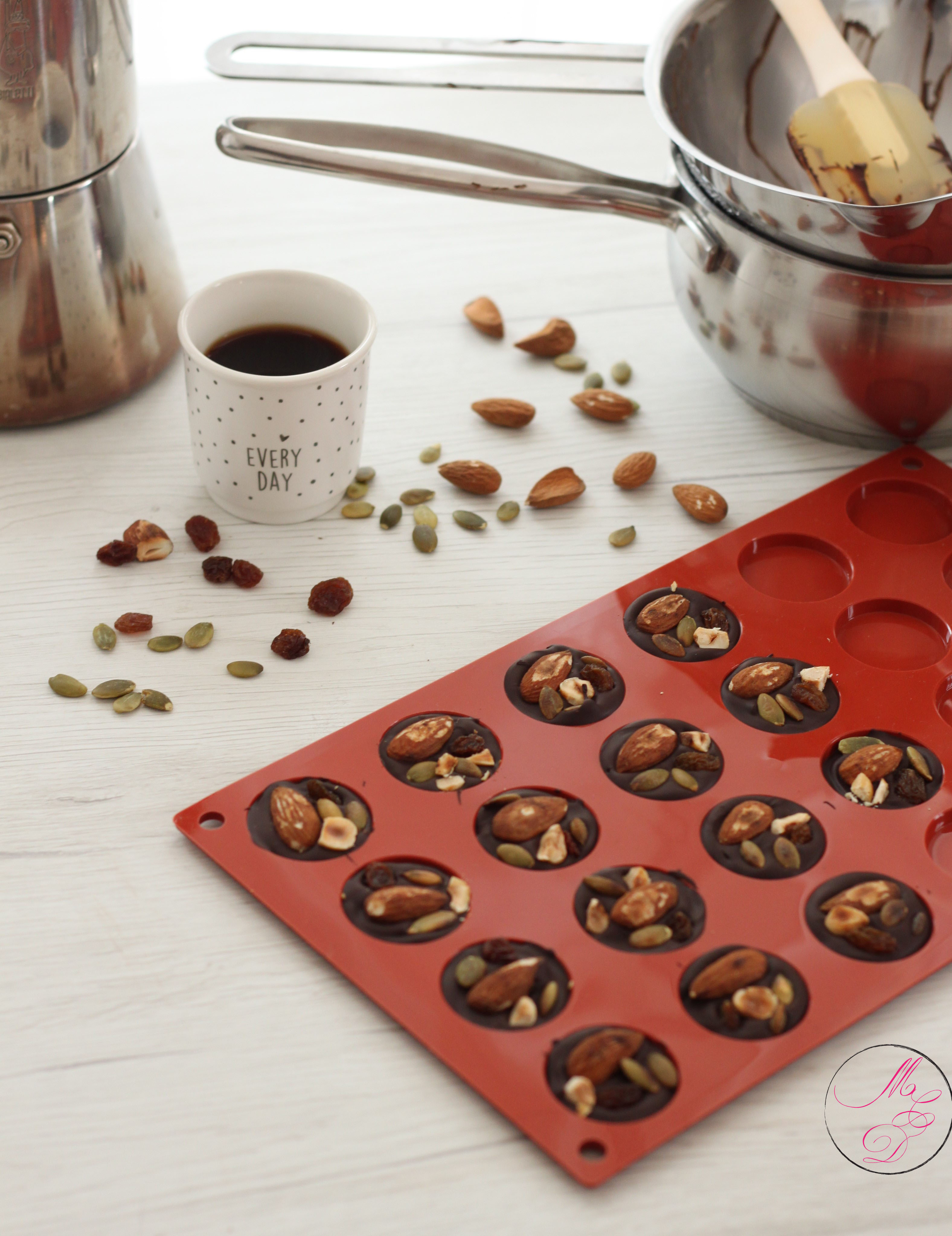 - J’ai utilisé le moule à chocolats en silicone (24 chablons) de la marque Alice Délice. La taille des chablons est parfaite et le démoulage impeccable ! Avec cette même recette, vous pouvez aussi réaliser des tablettes de chocolat en utilisant un moule spécial (comme celui-ci par exemple).
