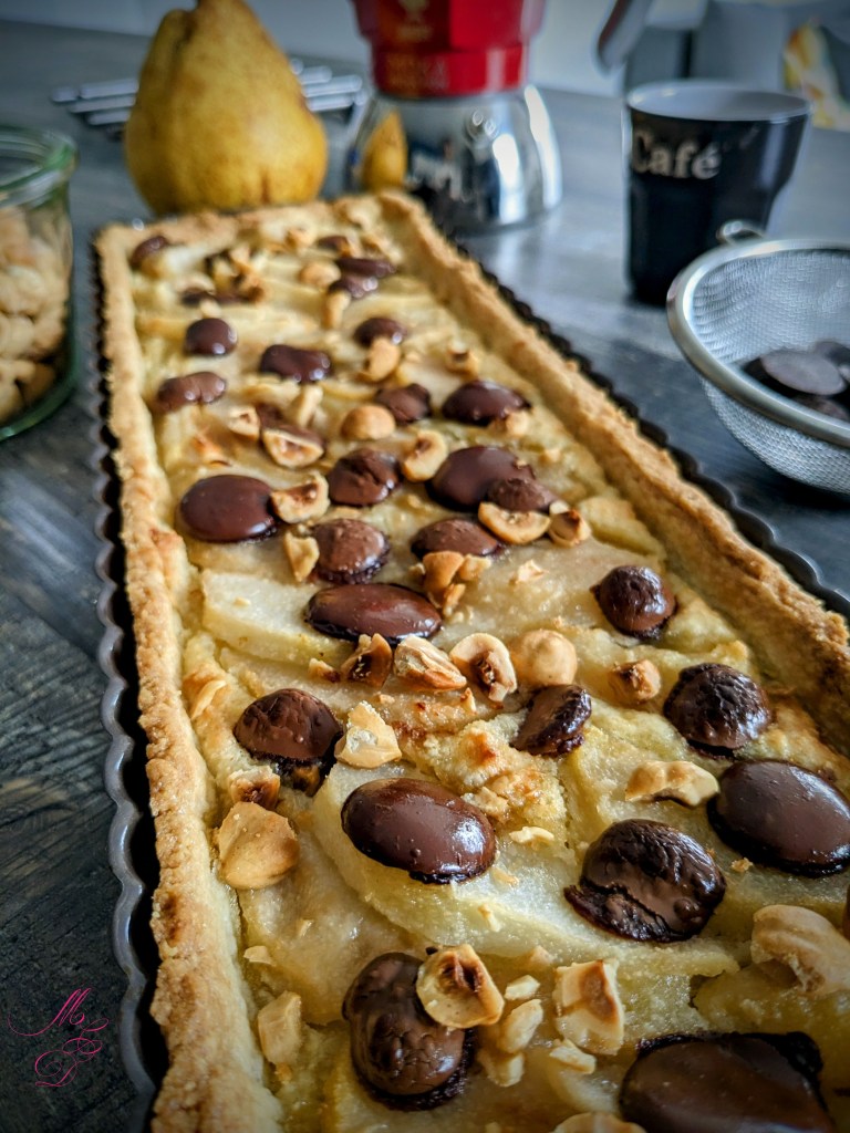 Ce que j’apprécie vraiment dans ce genre de desserts, c’est le mélange de textures : une pâte bien croustillante, une crème d’amande moelleuse et des poires fondantes. Sans oublier les pistoles de chocolat et les noisettes concassées … c’est LA touche de gourmandise en plus qui vient parfaire le tout !