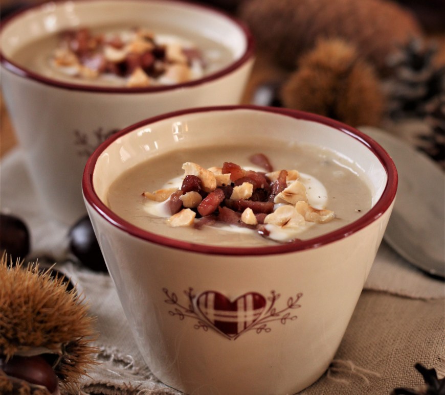 Mes nombreuses balades en forêt m’ont permis de cueillir pas mal de châtaignes cette année encore. La plupart ont fini en crème de marrons mais j’en ai utilisées aussi dans mes potages. En effet, ajouter quelques châtaignes dans une soupe de légumes permet d’obtenir (en plus du bon goût de châtaigne) une texture crémeuse et soyeuse du fait de la présence importante d’amidon qui va … Continuer de lire Velouté de châtaignes au lard & noisettes