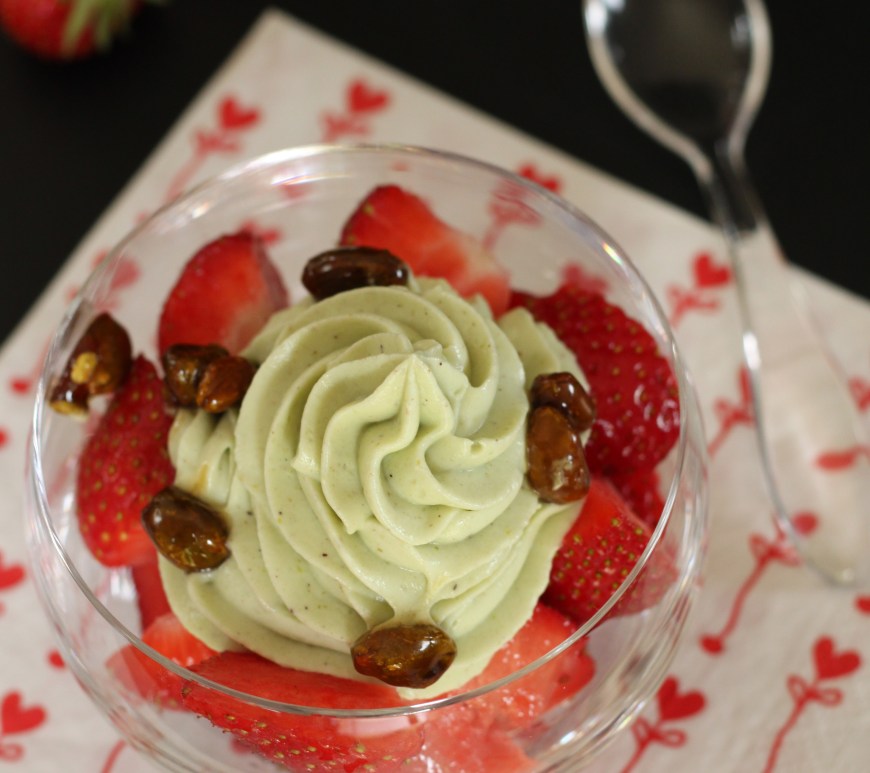 Pour accompagner nos dernières fraises du jardin, j’ai opté pour une ganache montée au chocolat blanc et pistache, le tout décoré avec quelques pistaches caramélisées pour apporter la touche de gourmandise. Il suffit parfois de peu de choses pour voir les yeux de ses convives s’illuminer à l’arrivée du dessert sur la table : quelques fraises bien goûteuses, une crème parfumée, un peu de croquant et le tour … Continuer de lire Verrine fraise, crème pistache & pistaches caramélisées