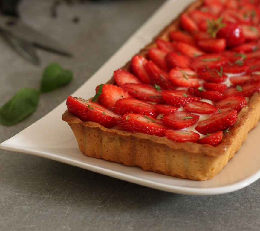 Tarte aux fraises au chocolat blanc, poivre du Sichuan & basilic