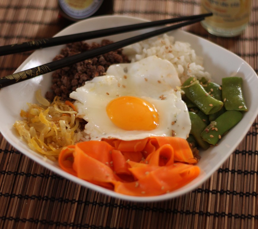 Le Bibimbap (plat coréen œuf, riz, bœuf et légumes sautés)