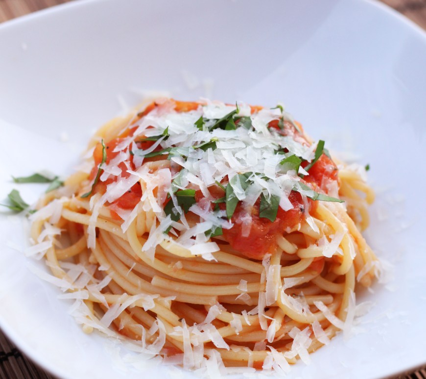 Spaghetti aux tomates fraîches, basilic & pecorino